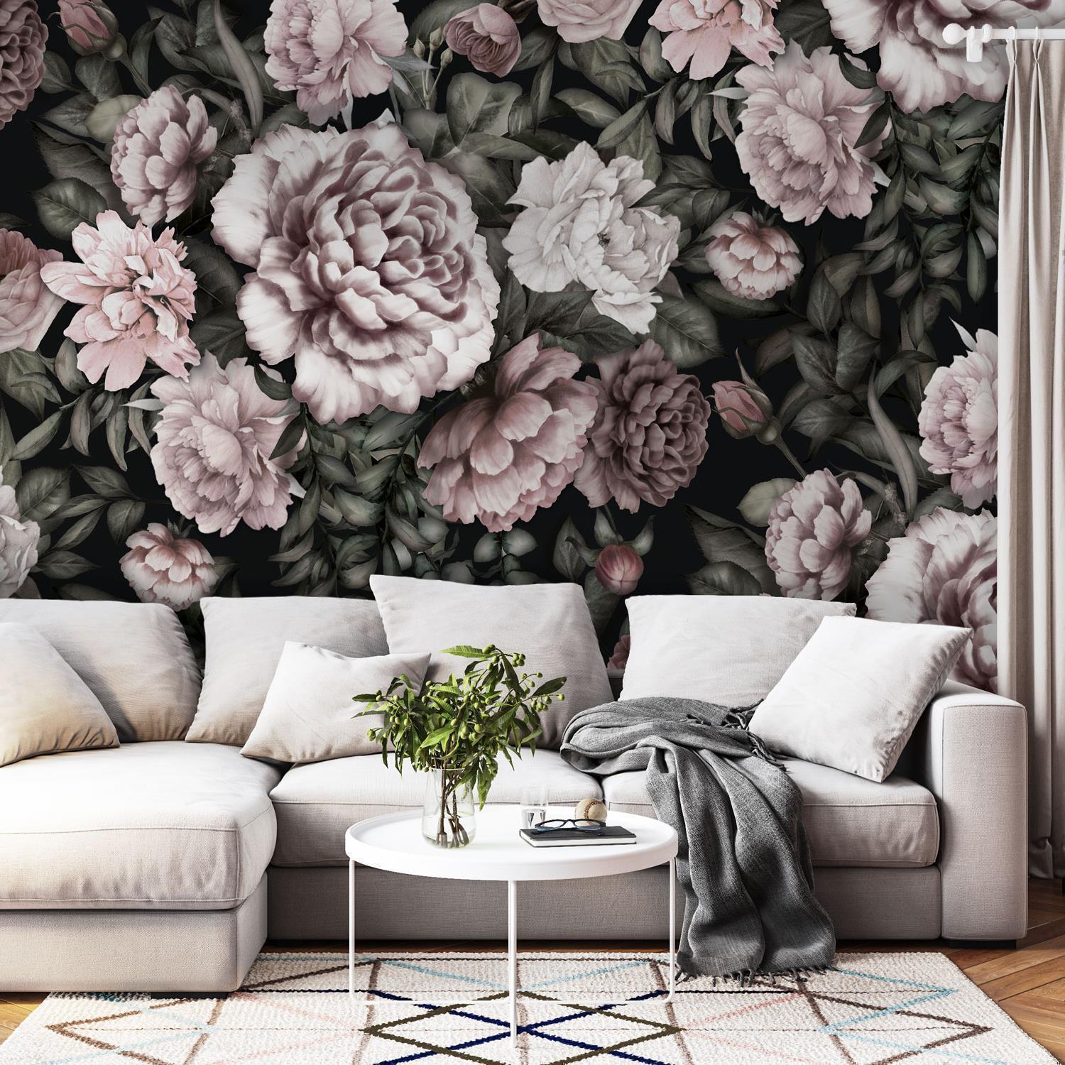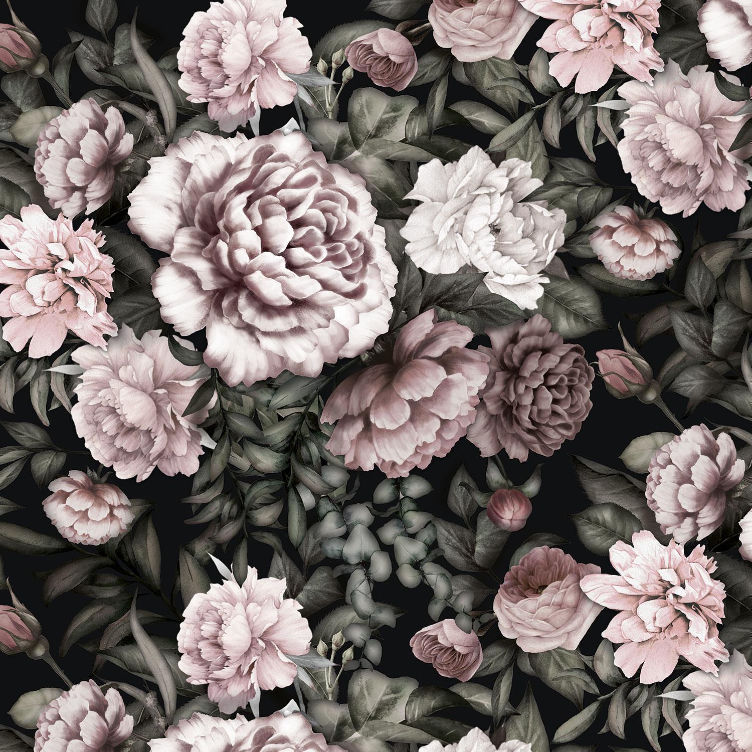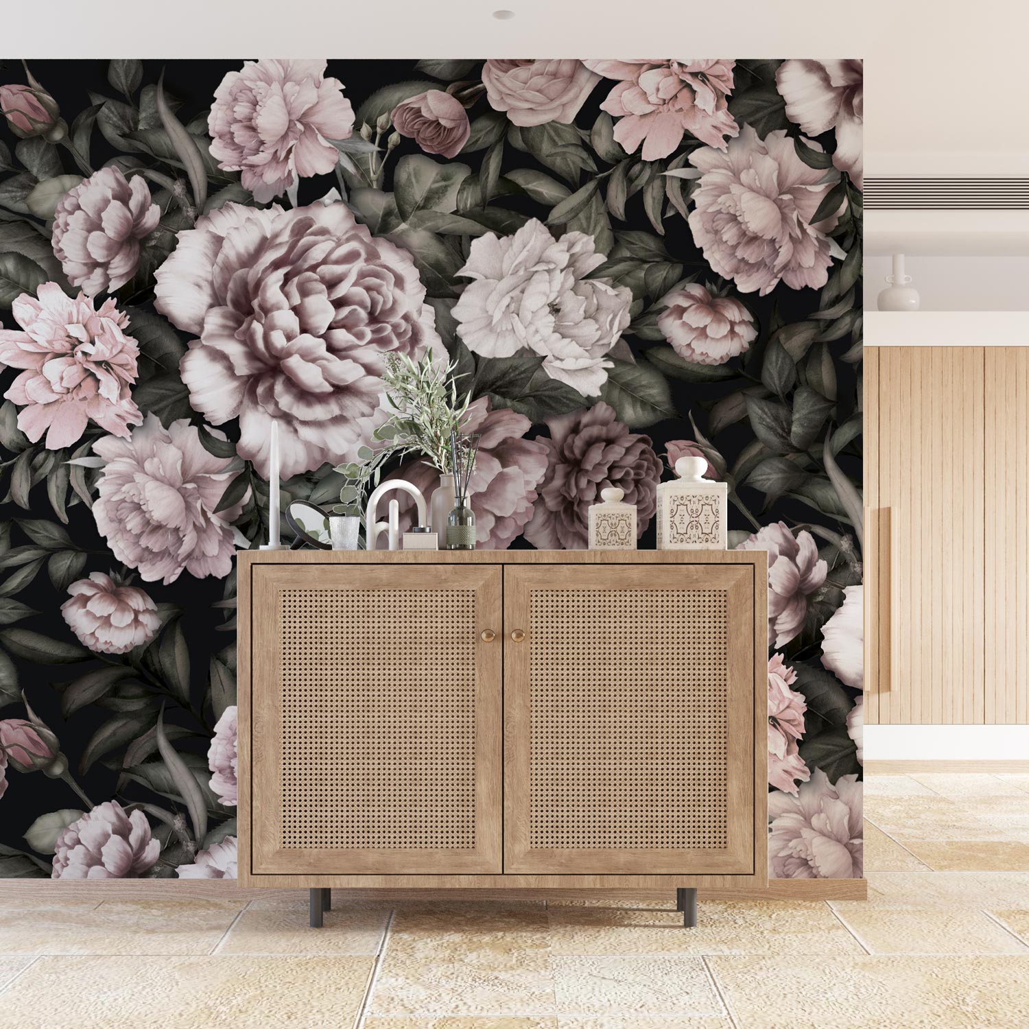 Bring mit dieser bezaubernden Fototapete ein Stück Natur in dein Zuhause. Die üppigen Blüten in zarten Rosa- und Grautönen ziehen alle Blicke auf sich und schaffen eine Atmosphäre voller Eleganz und Ruhe. Der tiefschwarze Hintergrund lässt die prächtigen Pfingstrosen noch intensiver leuchten und bildet einen perfekten Kontrast zu den dunkelgrünen Blättern. Kleine Blüten und Knospen ergänzen das stimmungsvolle Bild und sorgen für ein harmonisches Gesamtbild. Mit dieser Fototapete verwandelst du jeden Raum in einen Ort voller Stil und Gemütlichkeit. Lass dich von der Schönheit der Natur inspirieren.