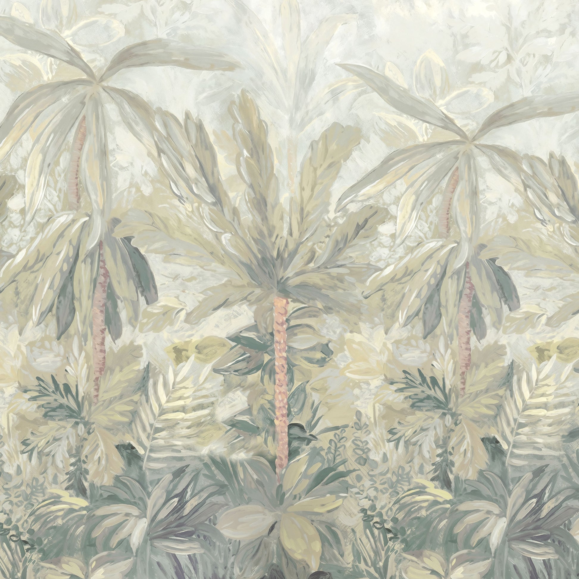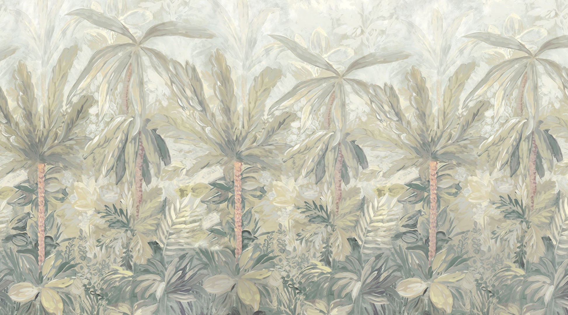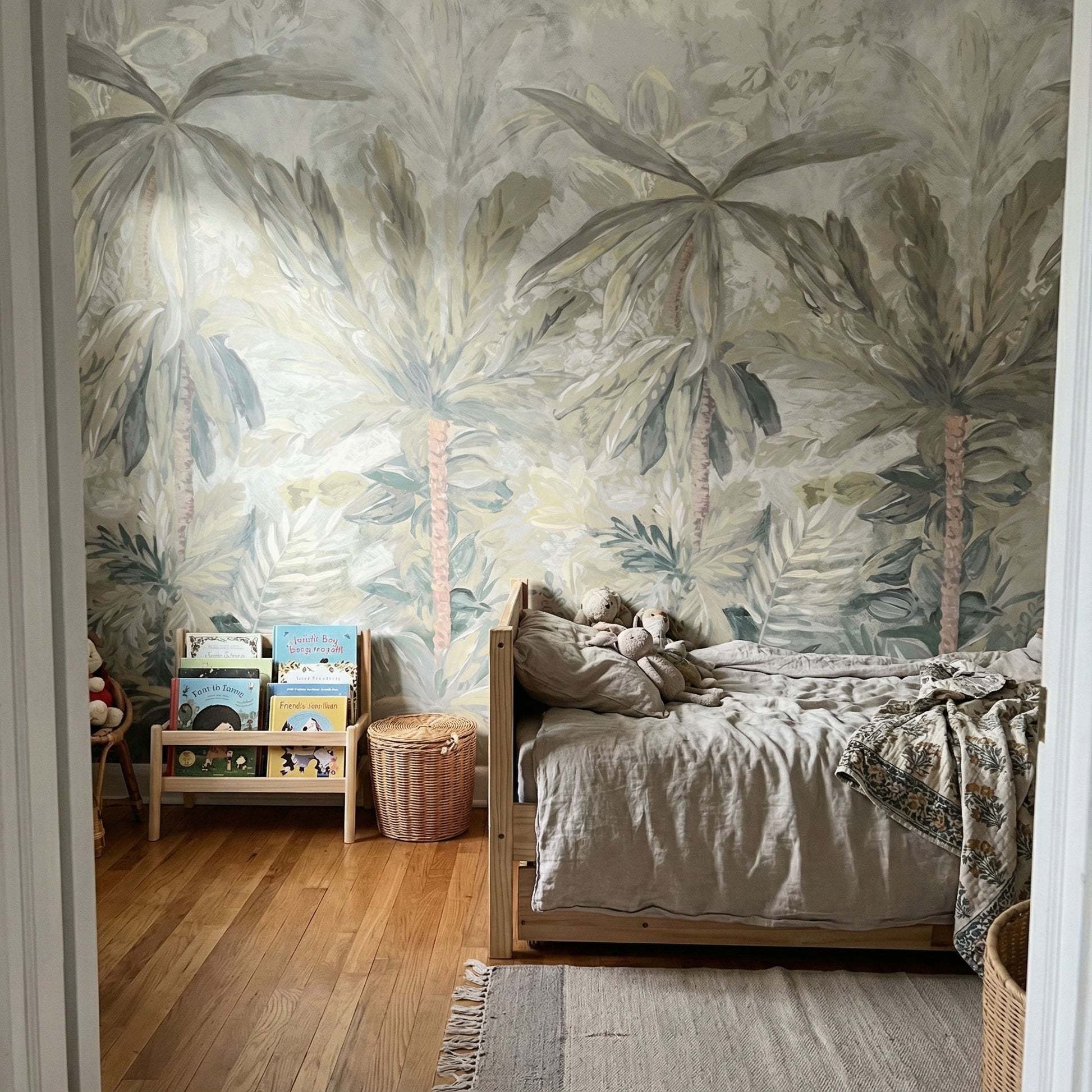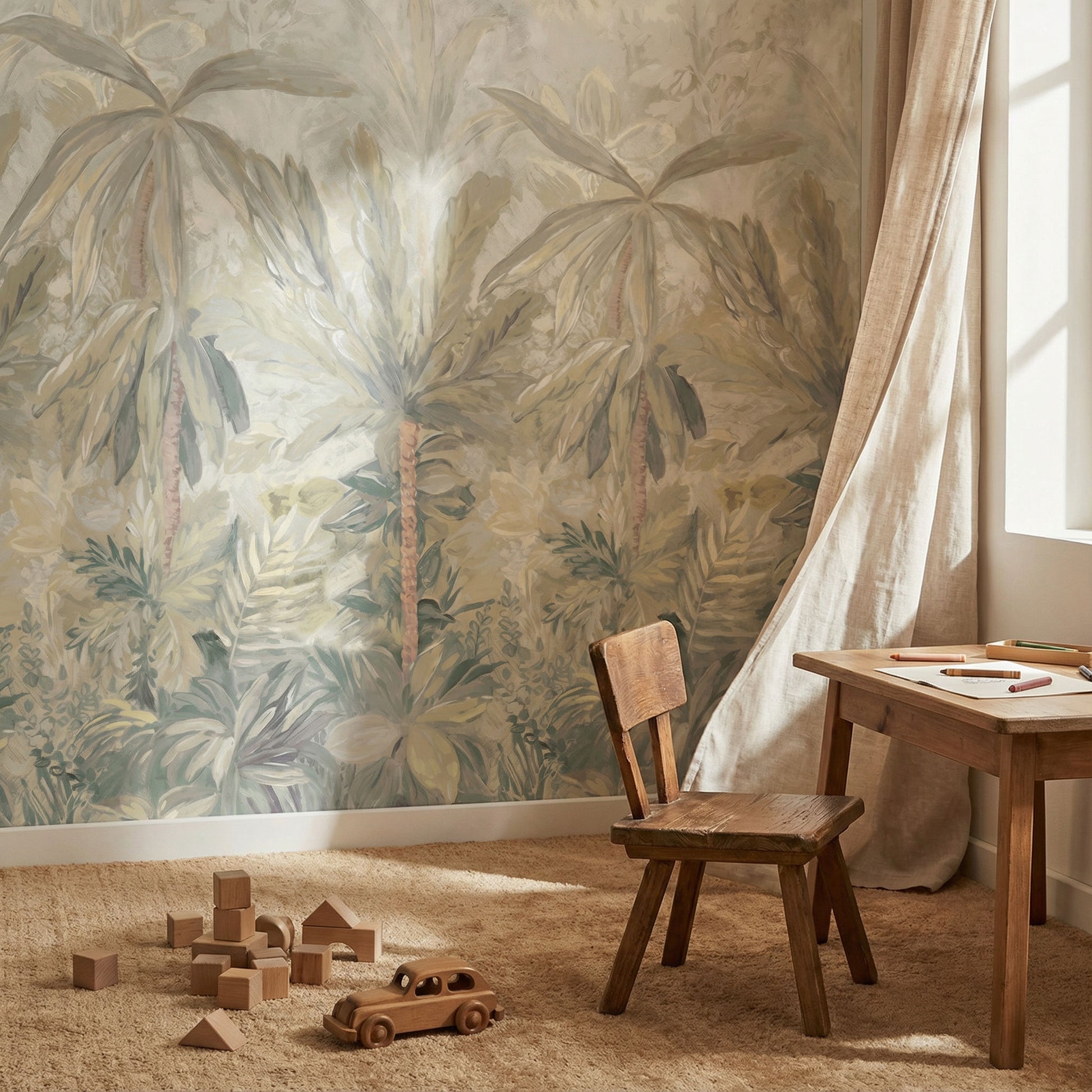 Mit der Kindertapete „Sanfter Dschungel“ zieht eine ruhige, tropische Atmosphäre ins Kinderzimmer ein. Zarte Palmen, weiche Blattformen und eine harmonische Farbpalette aus Beige-, Grün- und Cremetönen schaffen eine Umgebung, die Geborgenheit ausstrahlt und zugleich die Fantasie anregt.