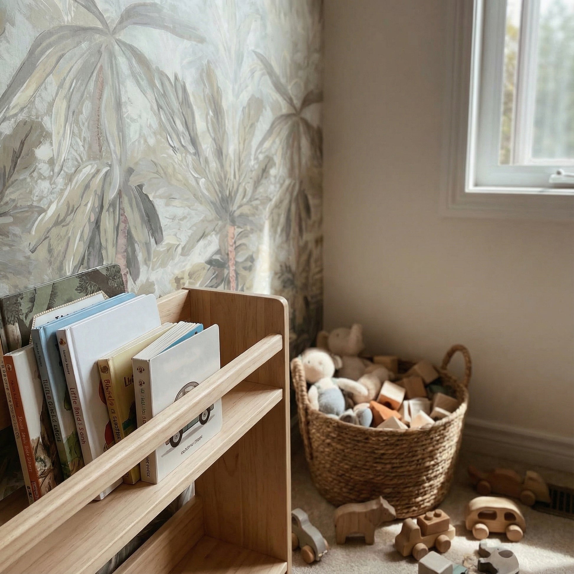 Das Motiv ist im sanften Aquarellstil gestaltet und wirkt bewusst zurückhaltend – perfekt für alle, die ein natürliches, zeitloses Kinderzimmer lieben. Die Tapete fügt sich mühelos in nordische Einrichtungen ein und harmoniert besonders schön mit Möbeln aus hellem Holz, warmen Naturtextilien oder dezenten Grautönen.