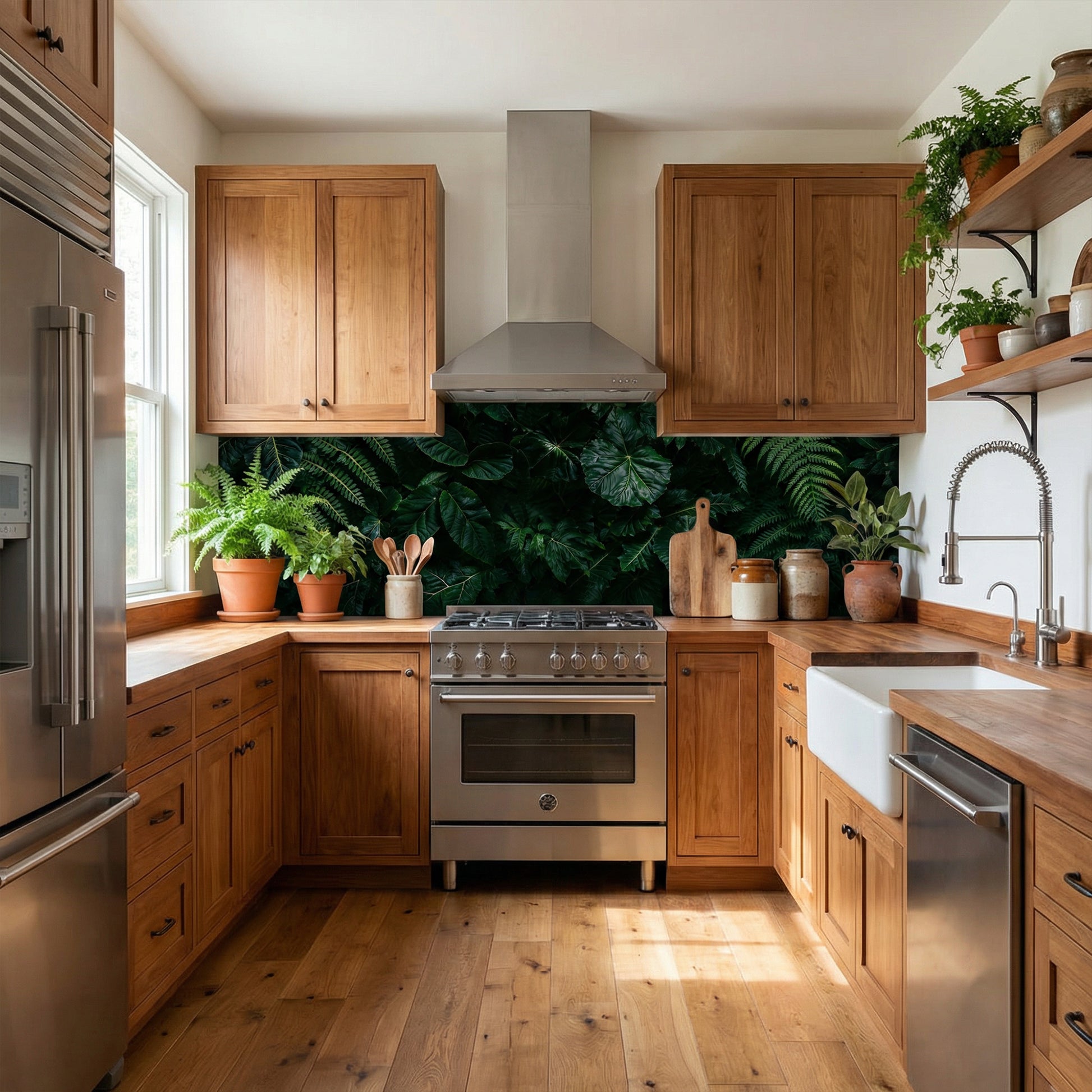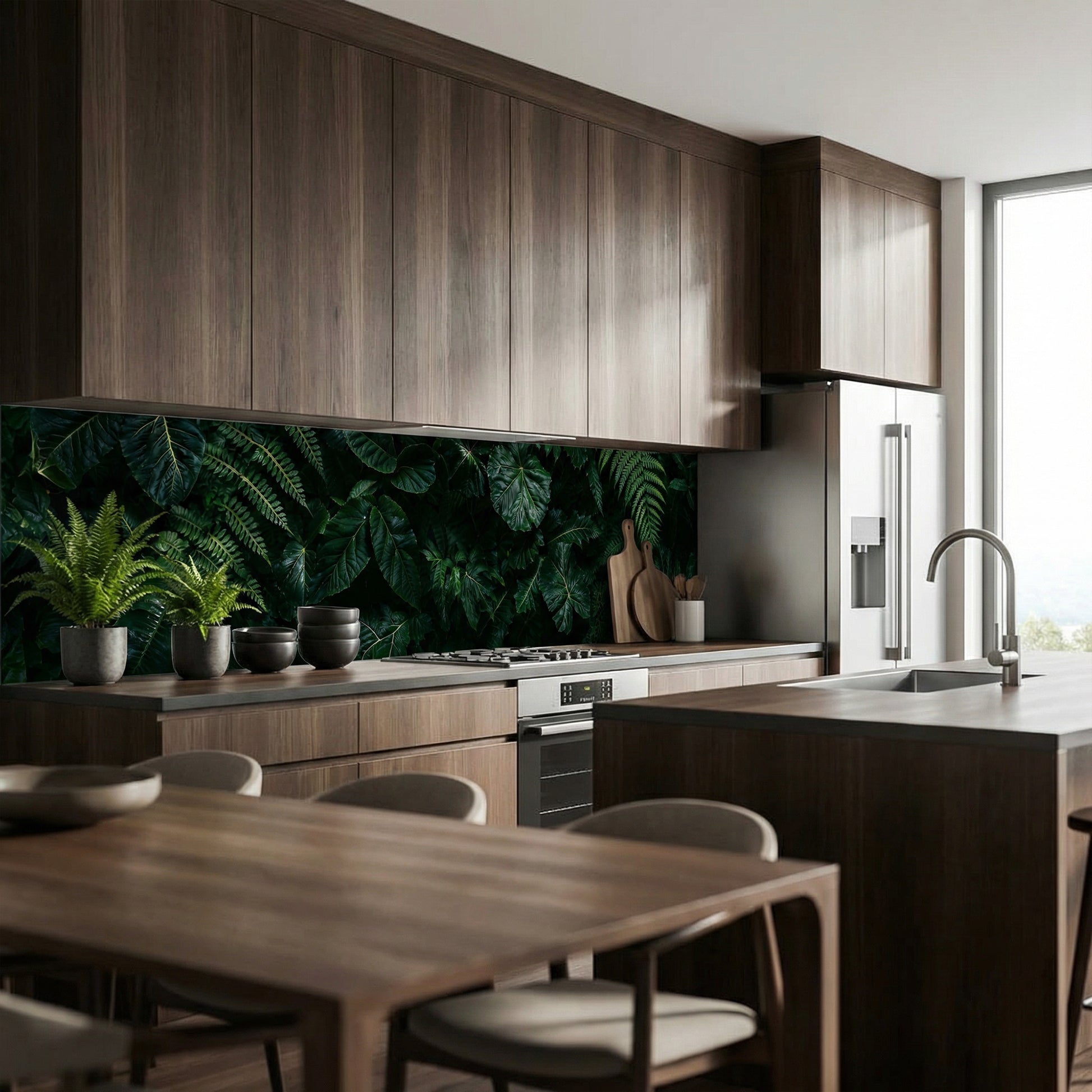 Bring den Zauber des Dschungels in deine Küche mit unserer einzigartigen Küchenfolie. Die dichte Ansammlung von verschiedenen grünen Blättern und filigranen Farnen auf einem dunklen Hintergrund schafft ein lebendiges und intensives Farberlebnis. Die glänzenden, dicken Blätter in Kombination mit den federartigen, zarten Formen lassen den Raum frisch und naturverbunden wirken. Diese Komposition verleiht deiner Küche ein Gefühl von Ruhe und Entspannung. Gestalte deinen ganz persönlichen Wohlfühlort mit diesem ausdrucksstarken Design, das nicht nur dekorativ, sondern auch funktional ist. Lass deine Küche erstrahlen mit der Energie der Natur!