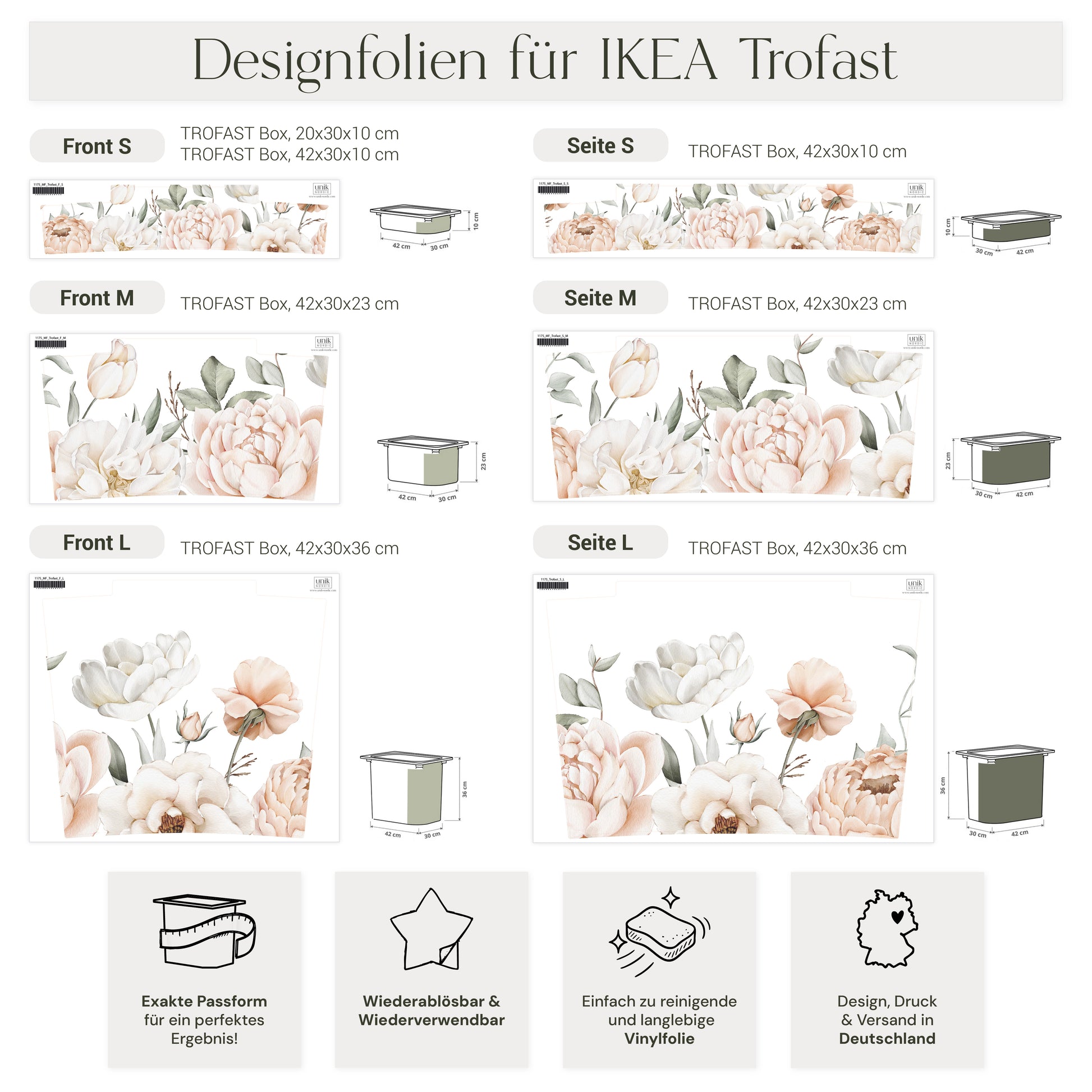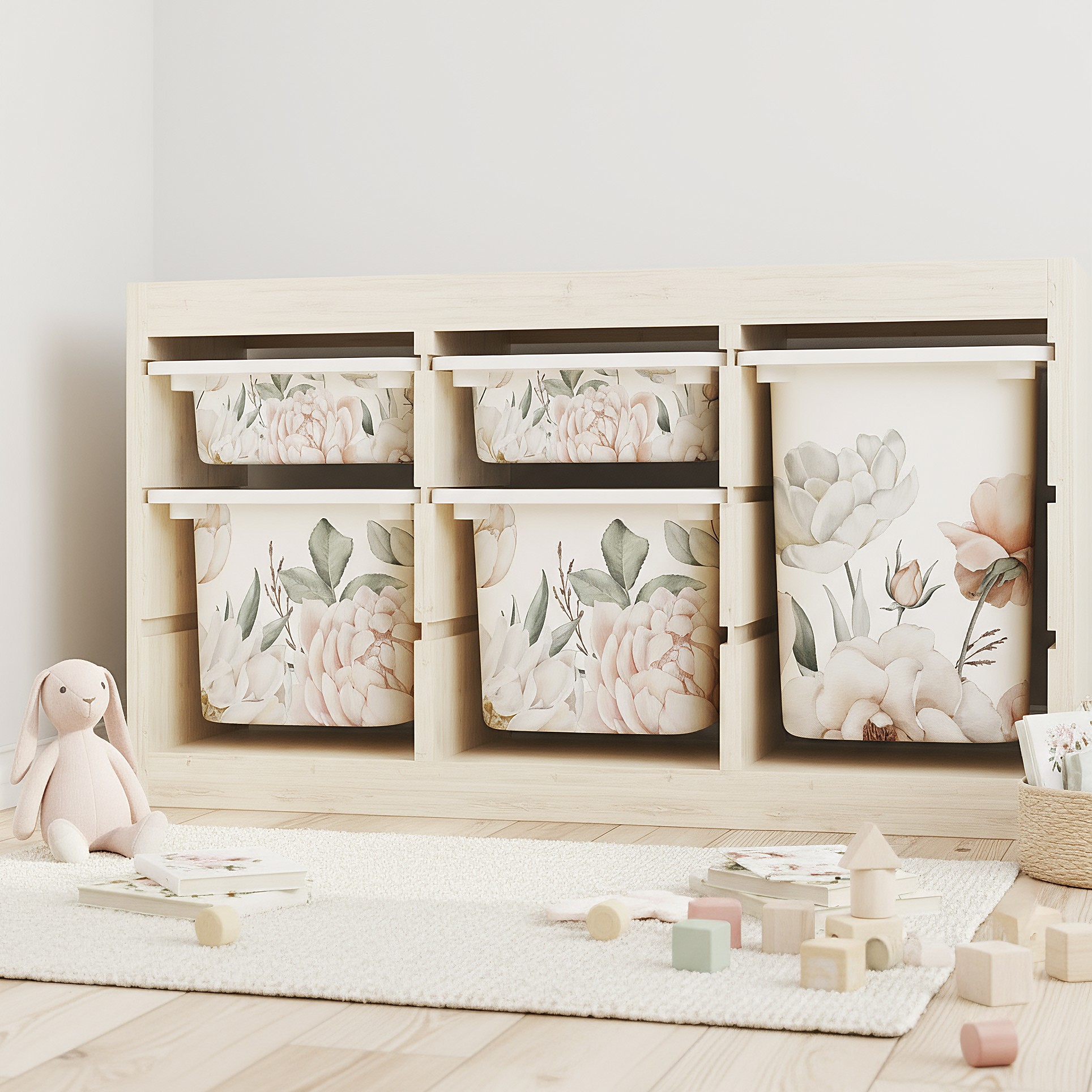 Unsere Sticker im zarten Aquarell-Stil zeigen Pfingstrosen, Magnolien und Eukalyptusblätter in sanften Beige-, Rosé- und Grüntönen. Sie verwandeln jede IKEA TROFAST Box in ein stilvolles Highlight – perfekt für alle, die Ordnung und Ästhetik verbinden möchten.