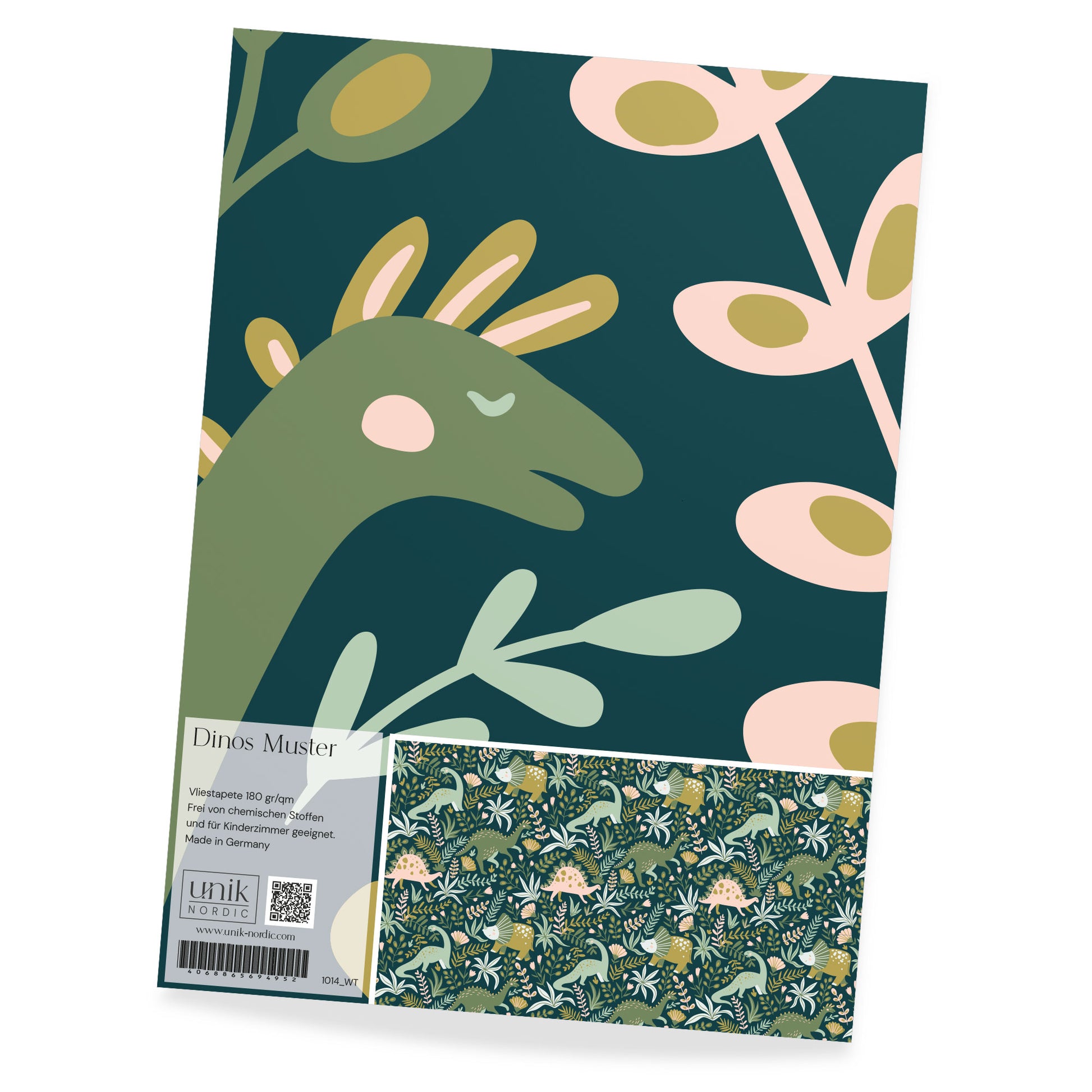 Das ist eine Materialprobe für Kindertapete Dinos Muster, damit du dich in Ruhe von der Qualität und dem hochwertigen Druck überzeugen kannst.