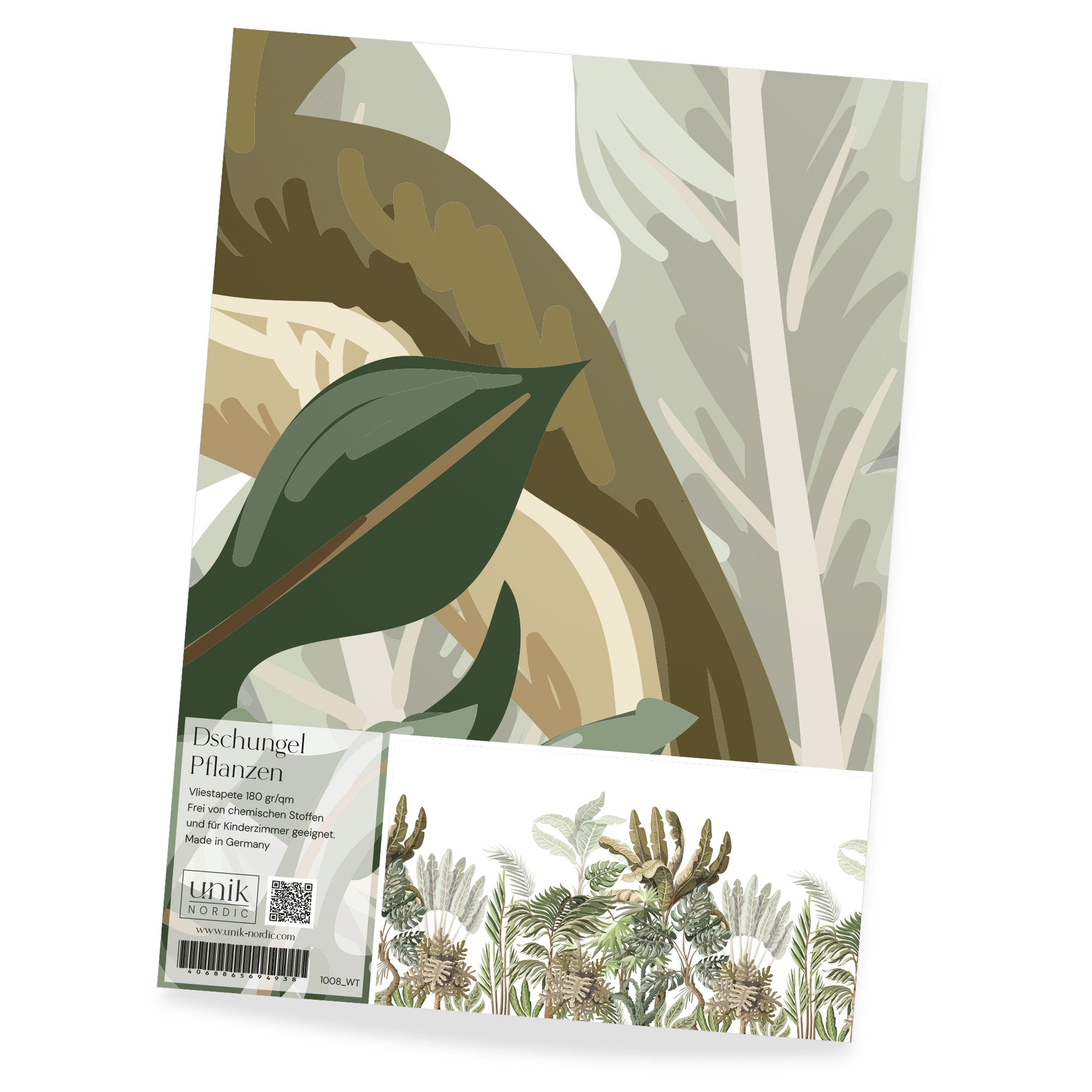 Das ist eine Materialprobe für Kindertapete Dschungel Pflanzen, damit du dich in Ruhe von der Qualität und dem hochwertigen Druck überzeugen kannst.