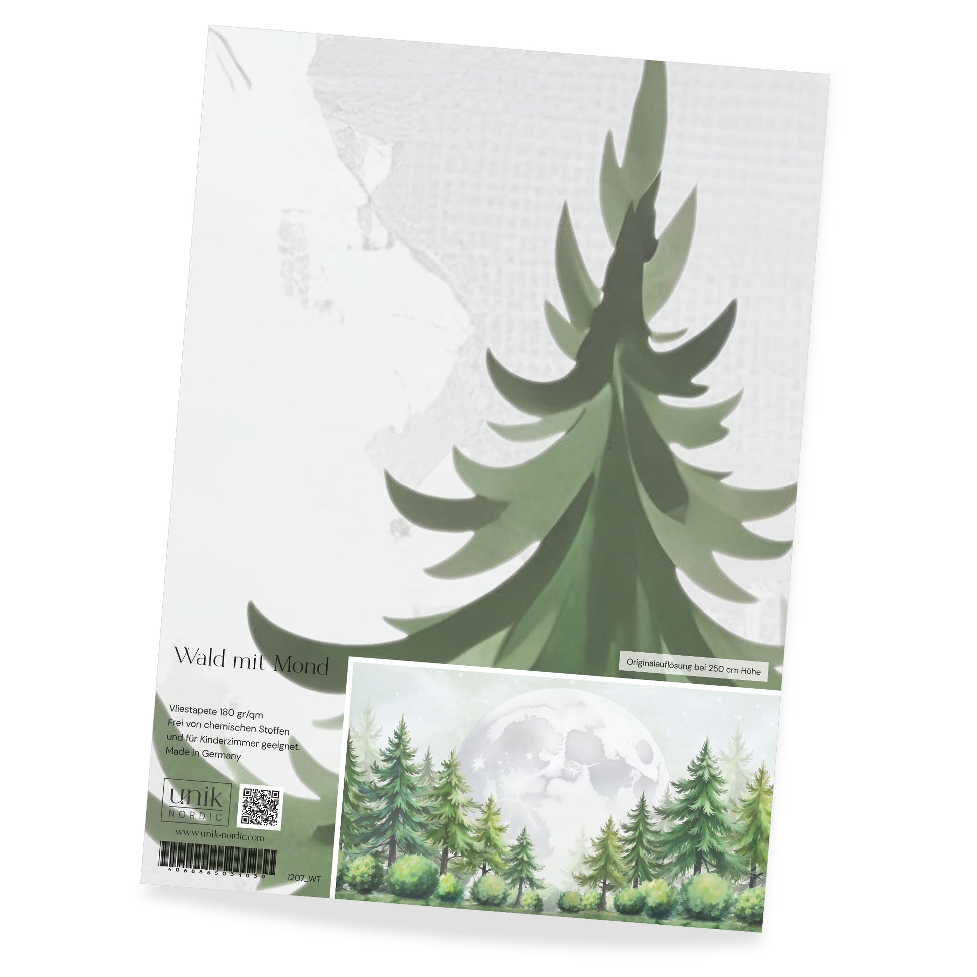 Das ist eine Materialprobe für Kindertapete Wald mit Mond, damit du dich in Ruhe von der Qualität und dem hochwertigen Druck überzeugen kannst.
