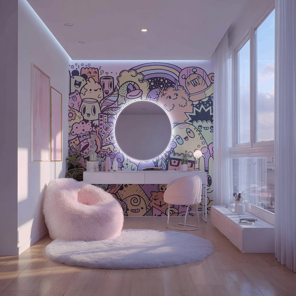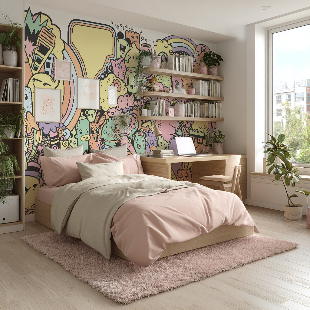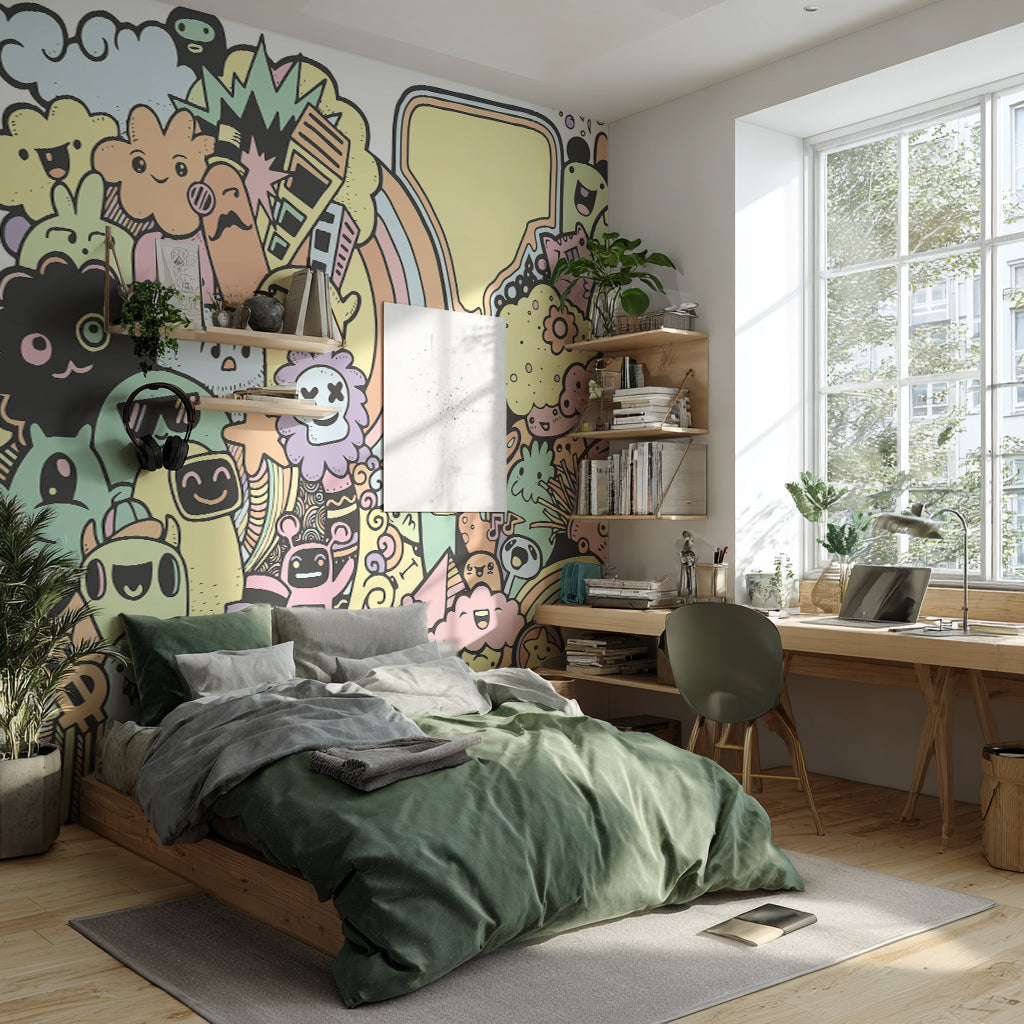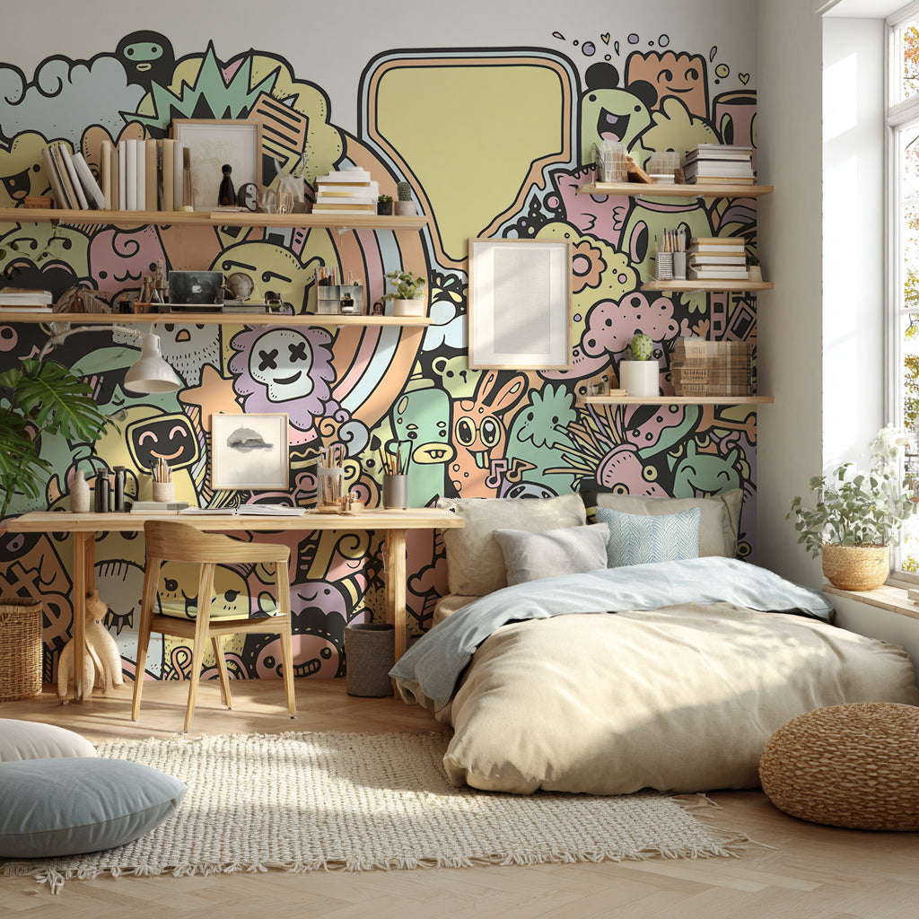 Bunte Pastellfarben, verrückte Figuren und jede Menge Details – dieses Motiv steckt voller Fantasie und guter Laune. Die fröhlichen Charaktere machen jede Wand zum Abenteuer und sorgen für eine spielerische, kreative Atmosphäre. Ideal für Kinder- und Jugendzimmer, in denen Spaß und Farbe nicht fehlen dürfen.