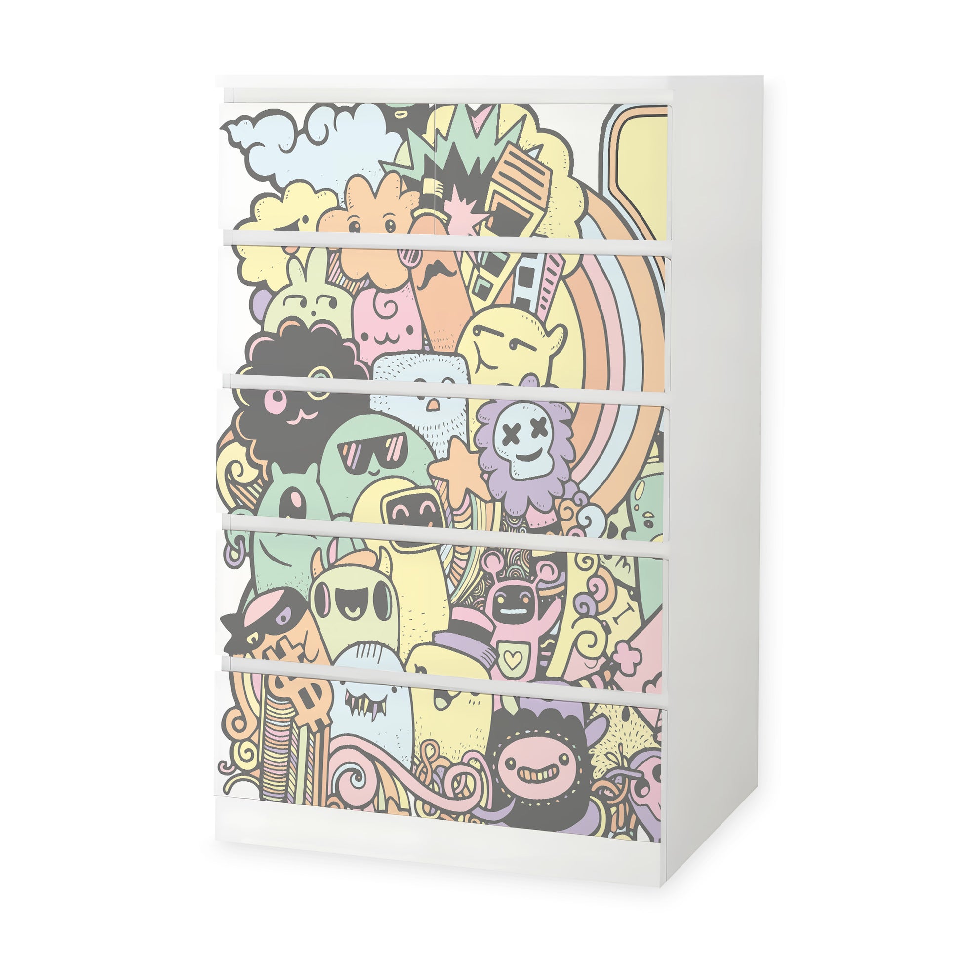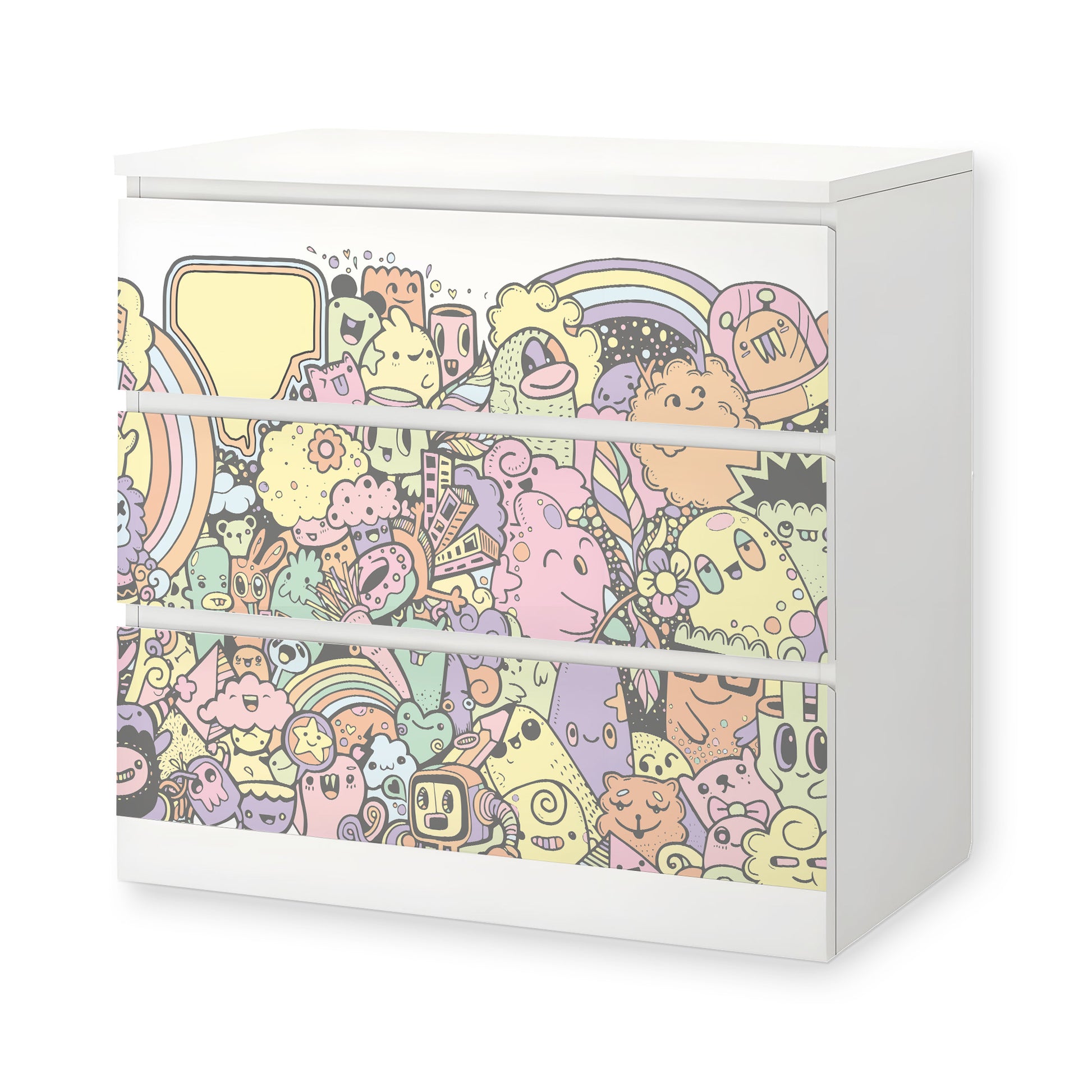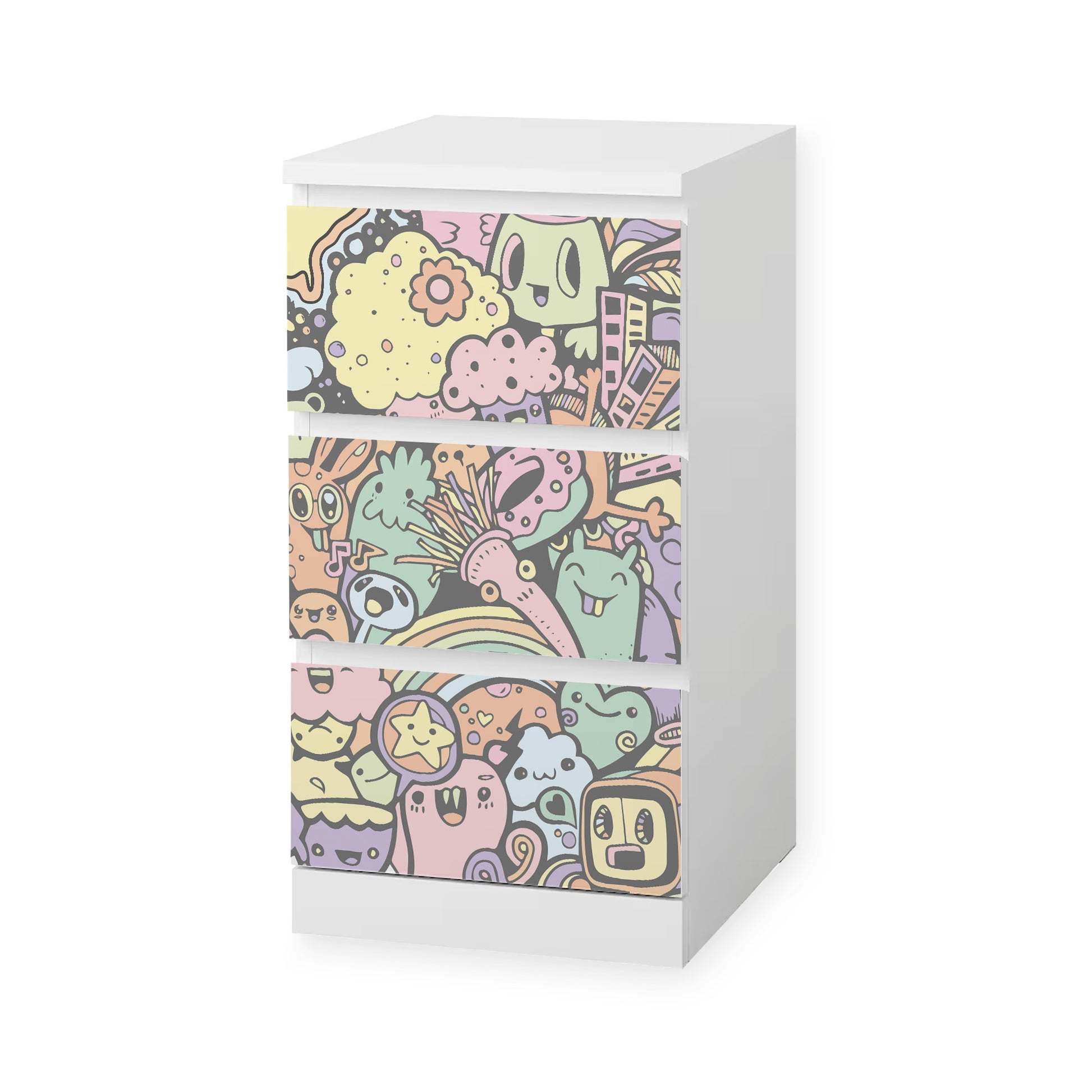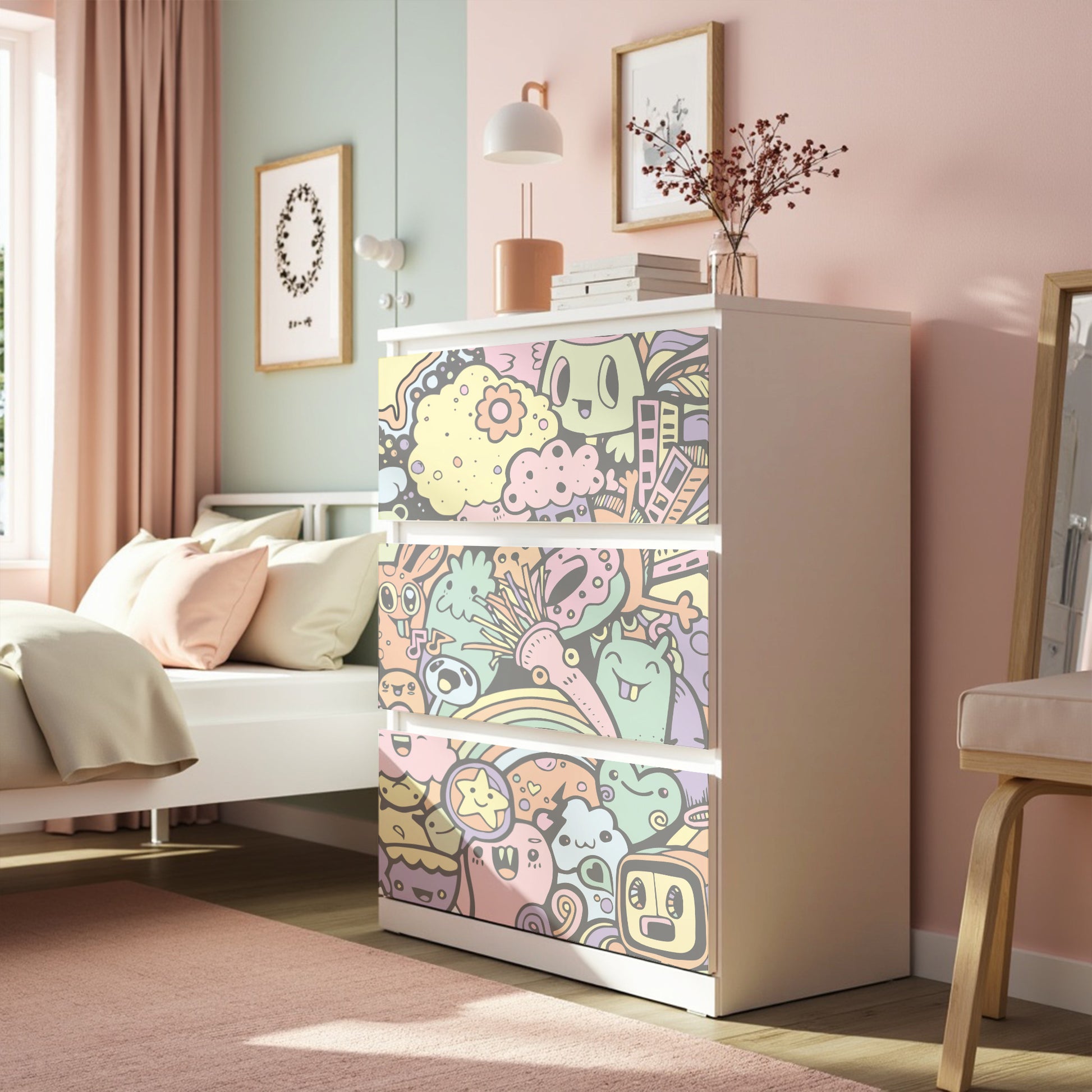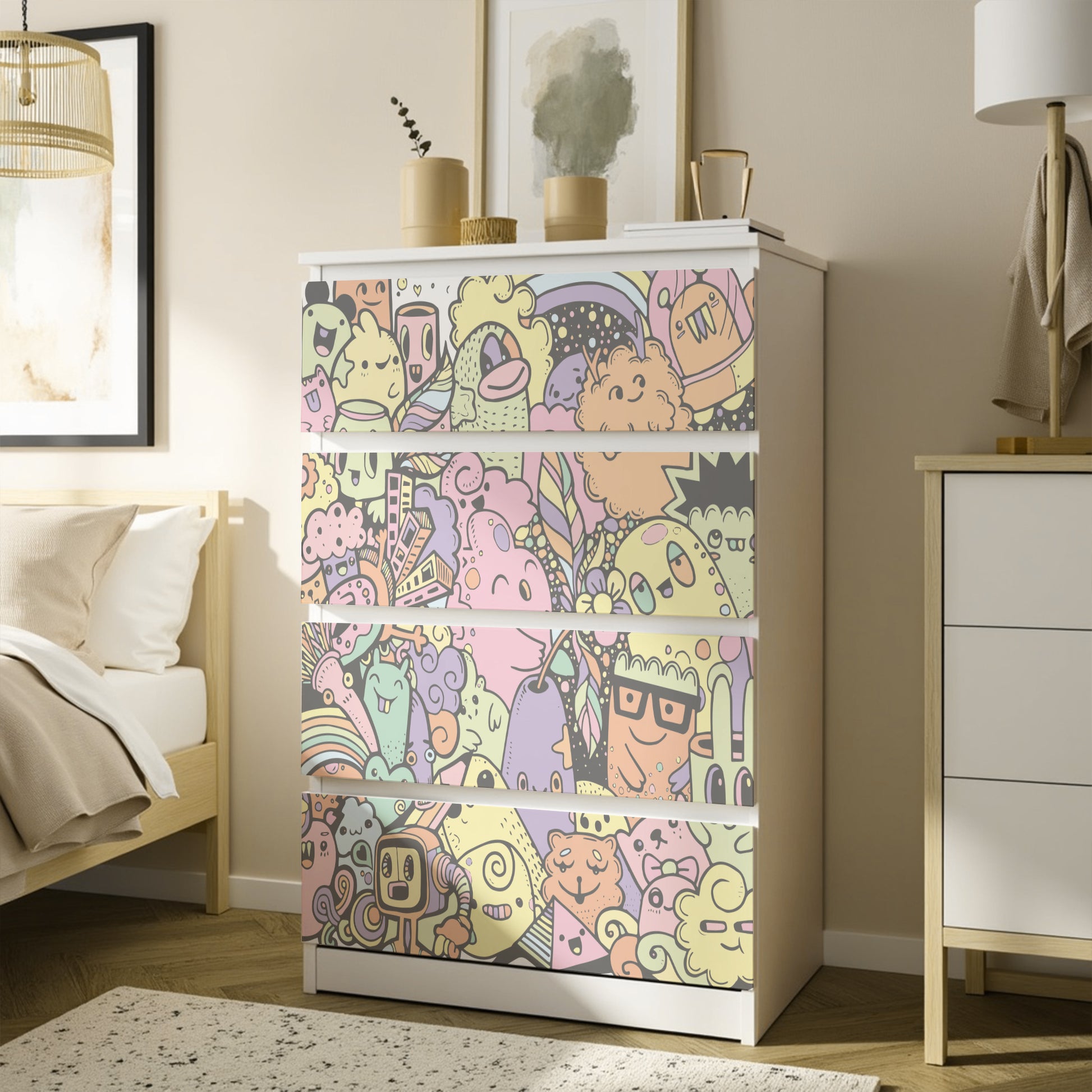 Verwandle deine IKEA Malm Kommode in ein echtes Highlight! Mit dieser farbenfrohen Möbel-Folie voller witziger Figuren und pastellbunter Details wird aus einem schlichten Möbelstück ein kreativer Hingucker. Perfekt, um Kinder- und Jugendzimmer mit Persönlichkeit, Spaß und einem Hauch Fantasie aufzupeppen. Einfach anzubringen, individuell und garantiert ein Blickfang.