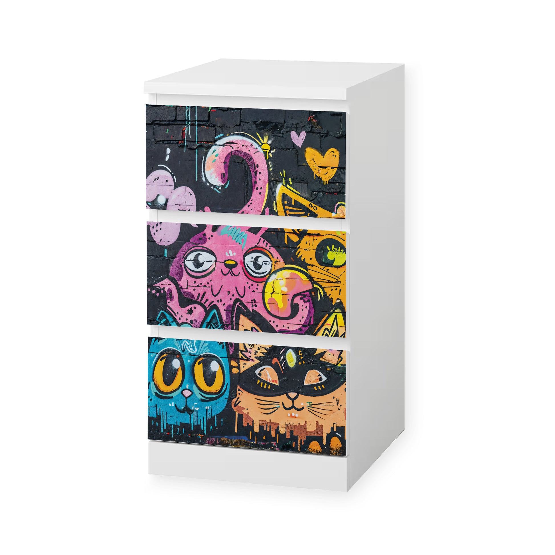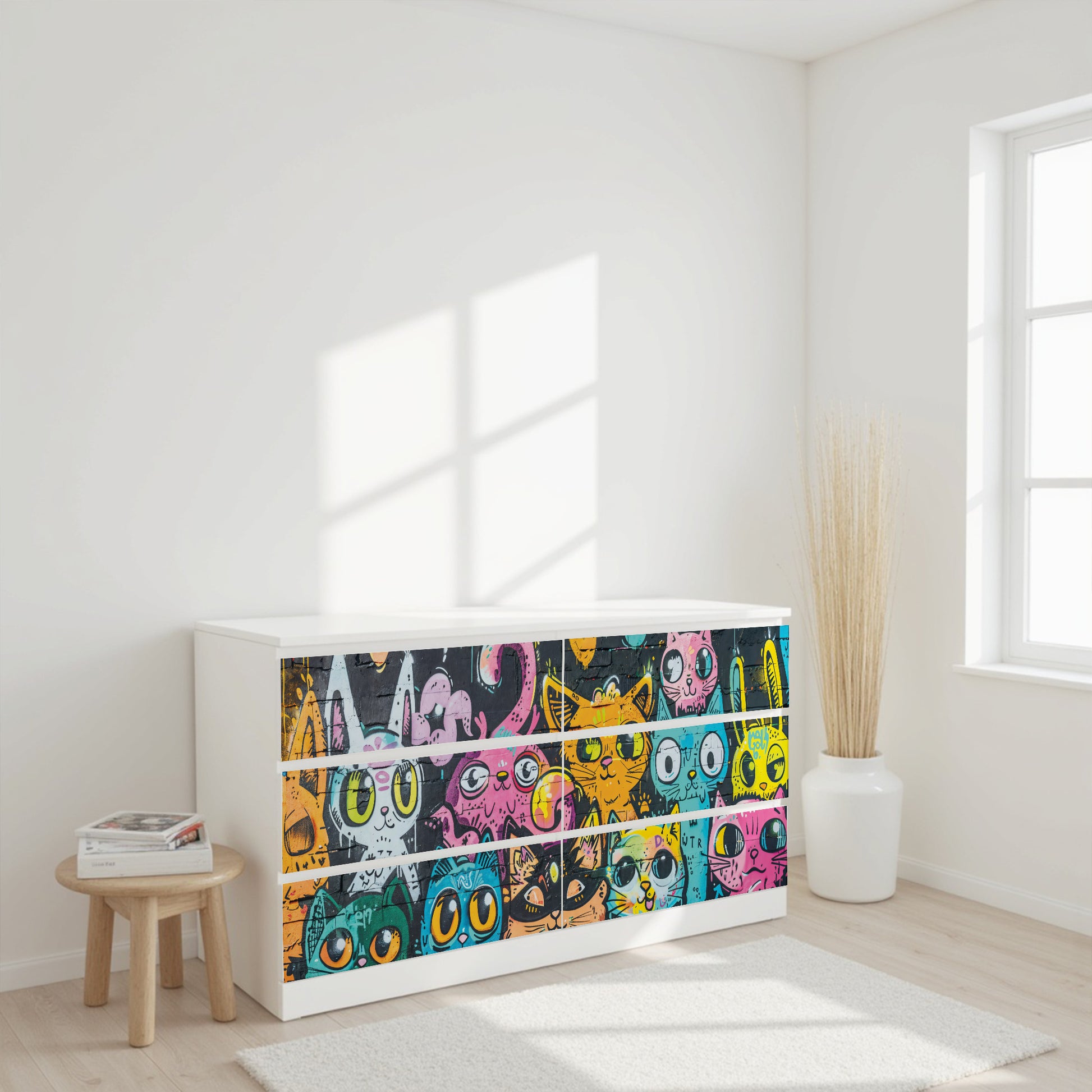 Mach deine IKEA Malm Kommode zum echten Hingucker! Mit dieser farbenfrohen Möbelfolie im Street-Art-Stil voller witziger Katzen-Charaktere bringst du urbanes Flair und gute Laune ins Zimmer. Ideal, um Möbel individuell zu gestalten und einen coolen Akzent im Jugendzimmer zu setzen.