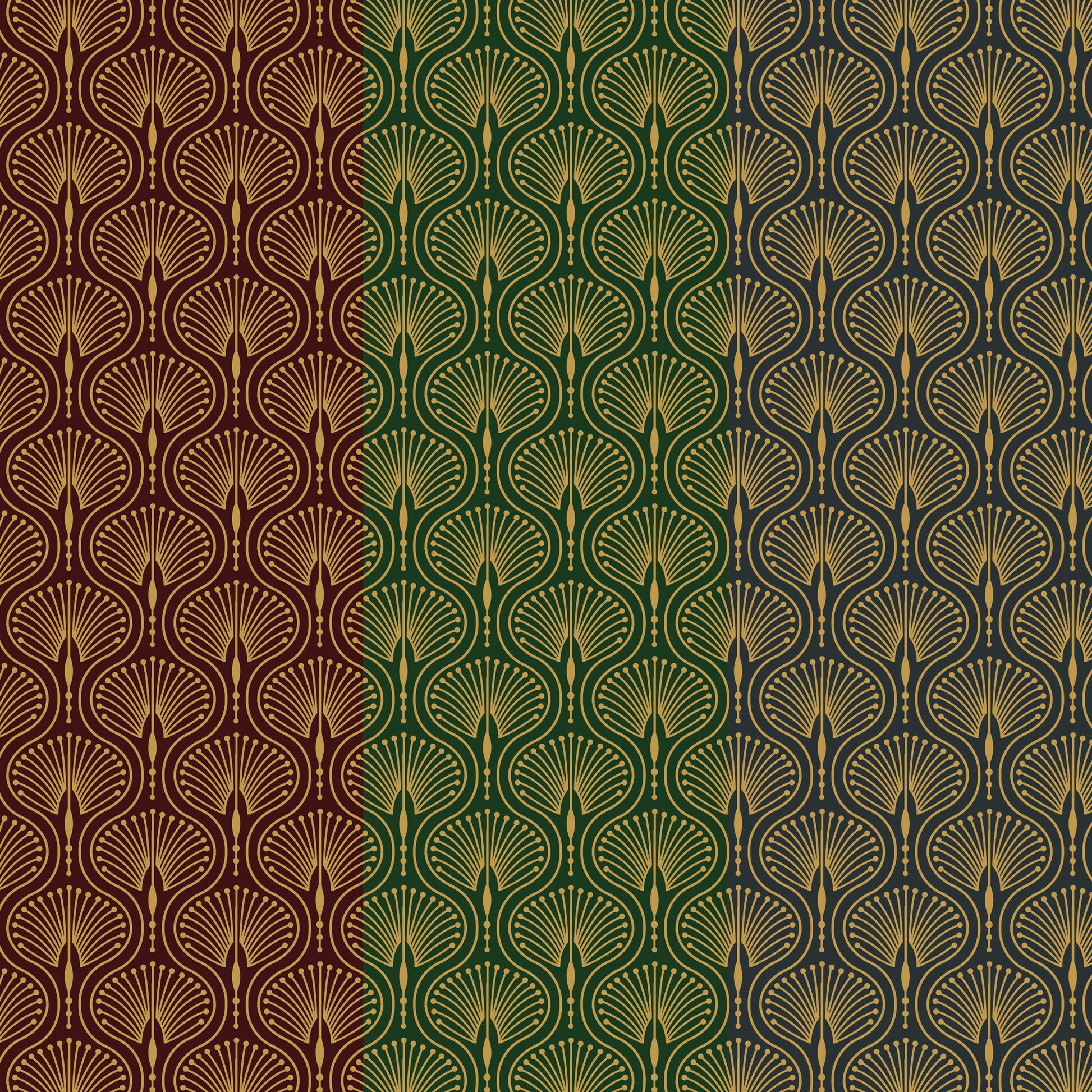 Tiefes Bordeaux mit goldenen Art-Déco-Fächern – dieses Muster versprüht opulenten Charme und erinnert an die mondänen Ballsäle der Goldenen Zwanziger. Besonders wirkungsvoll als Statement-Wall hinter dem Sofa oder im Eingangsbereich.