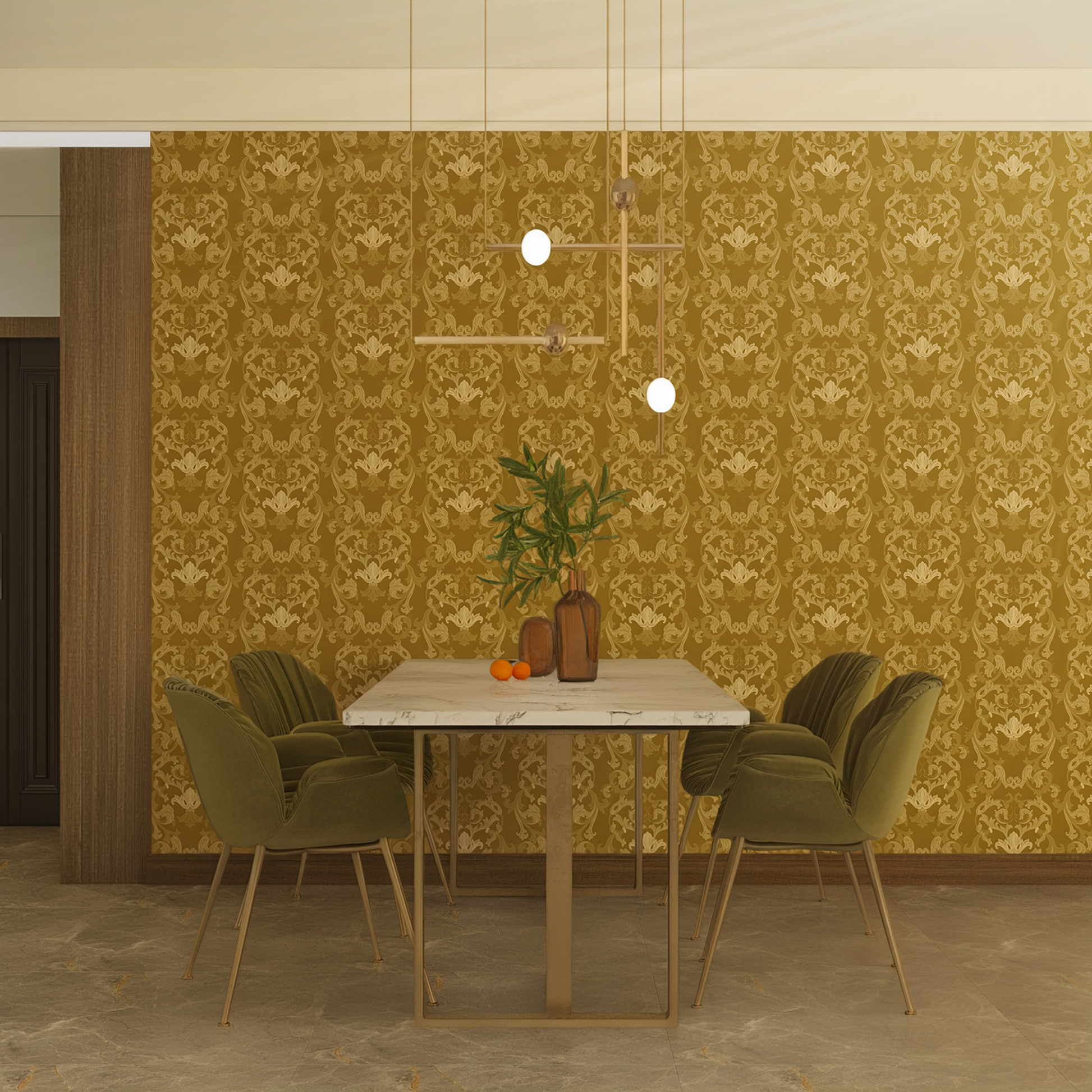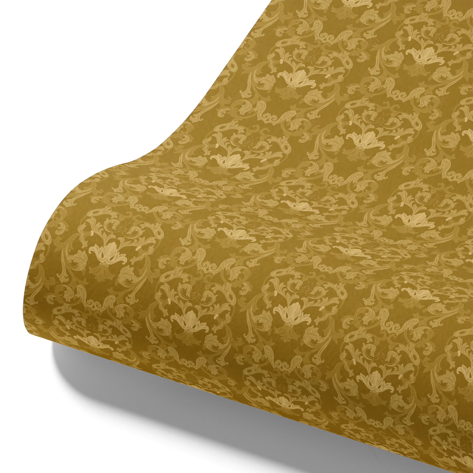 Ein ornamentales Rankenmuster in warmem Senfgelb auf goldbraunem Grund. Das monochrome Design verbindet verspielte Jugendstil-Anmutung mit schlichter Eleganz. Es wirkt klassisch, fast königlich, und entfaltet in historischen Räumen mit viel Holz oder warmen Akzenten seine ganze Wirkung. Ideal für alle, die Tradition und Stilbewusstsein mit einem modernen Twist kombinieren möchten.