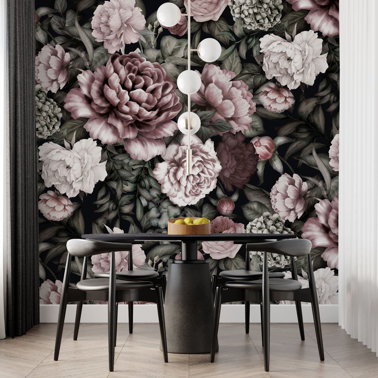 Bring a touch of elegance into your home with our photo wallpaper showcasing a lush floral display in soft shades of pink, white, and purple. The intricately detailed peonies and delicate blossoms stand out majestically against the deep black background, creating a captivating contrast and making the colors truly shine. This wallpaper lends any room a romantic yet vibrant atmosphere, perfect for adding a natural accent. Let yourself be inspired by the beauty of nature and transform your walls into your own personal sanctuary.