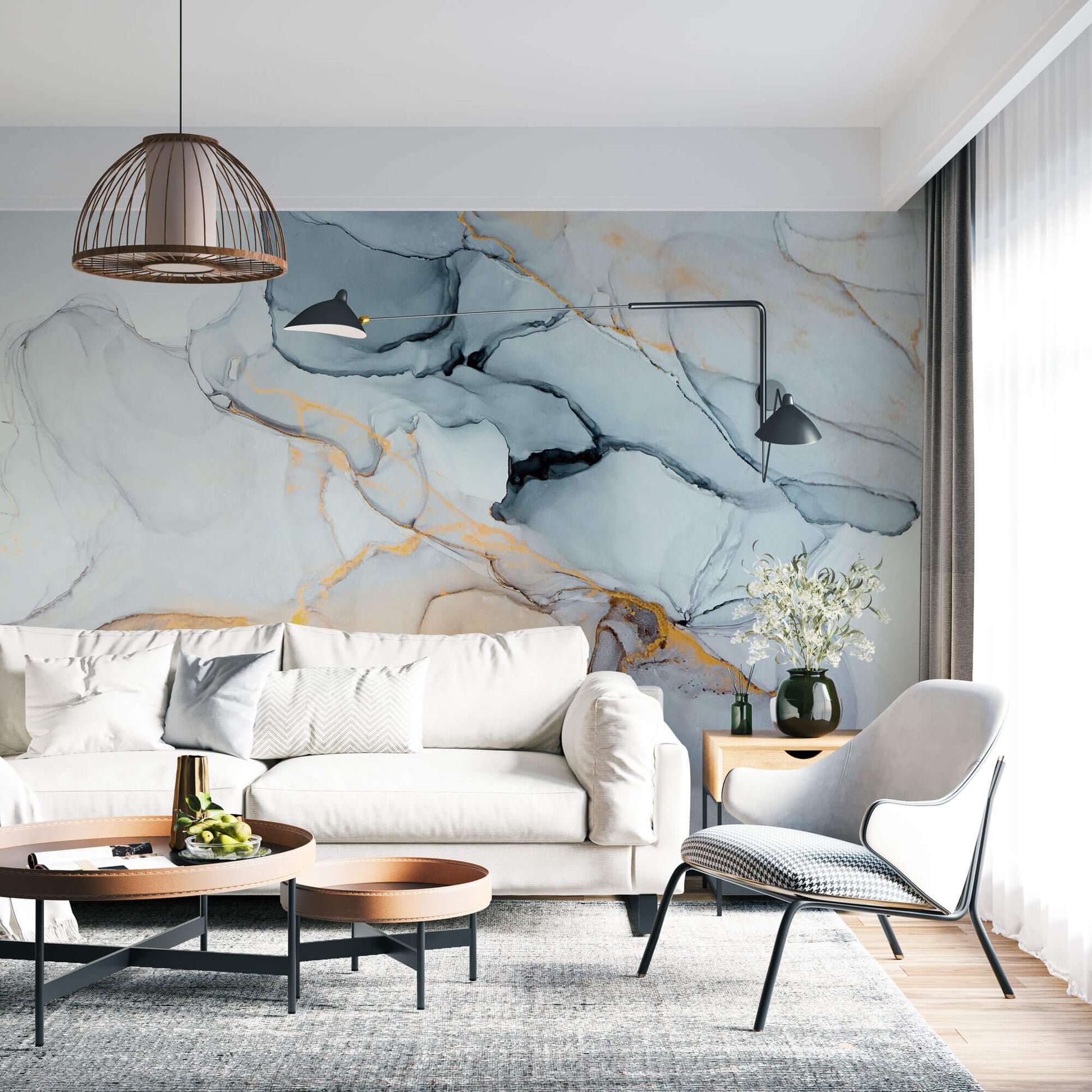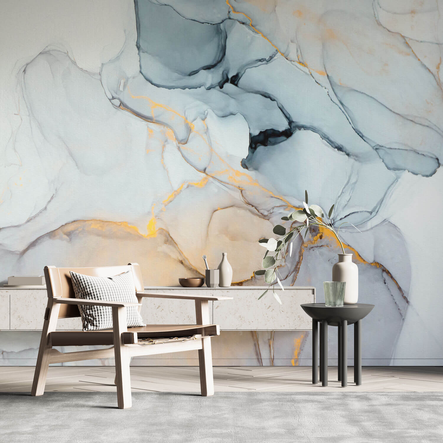 Experience the understated elegance of our photo wallpaper with flowing color gradients in gray, light blue, and beige. This harmonious composition of watercolor textures transforms your walls into a work of art brimming with lightness. Delicate golden lines run through the design, lending it a subtle touch of luxury. The calming hues create a modern and relaxed atmosphere, bringing a sense of tranquility and style to any room. Let your walls become a unique expression of your personal taste and enjoy the timeless beauty that our design brings to your home.
