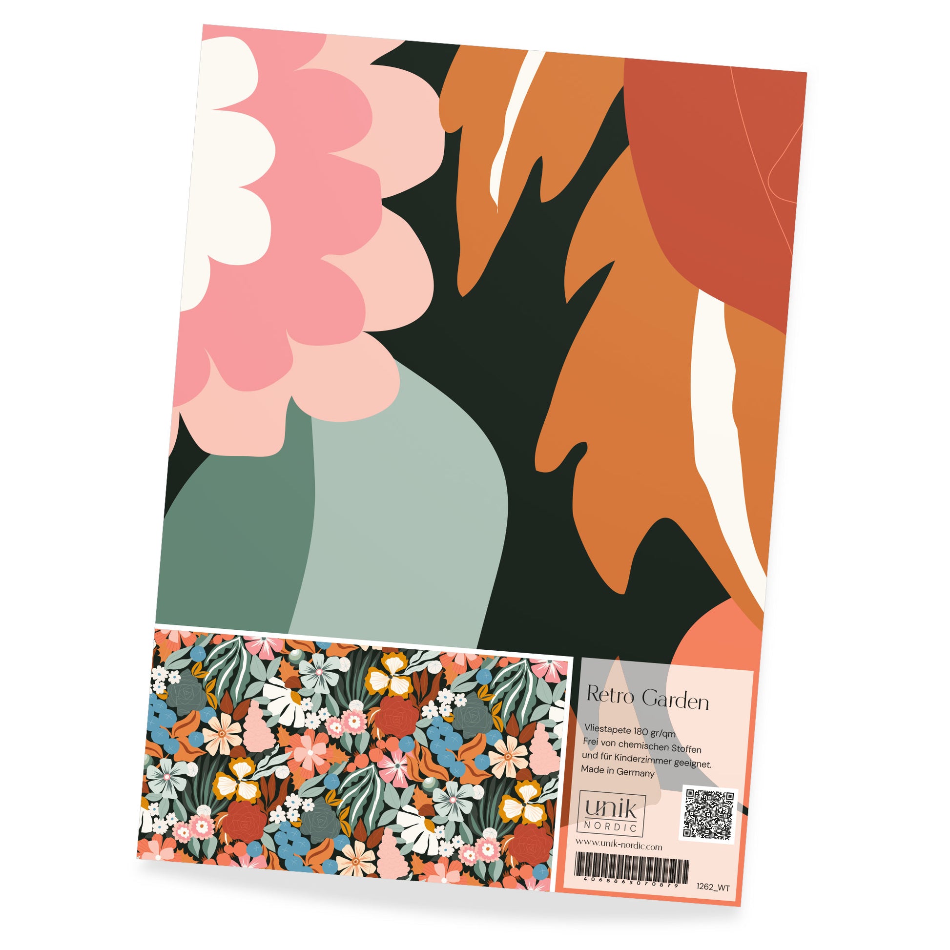 Das ist eine Materialprobe für Designtapete Retro Garden, damit du dich in Ruhe von der Qualität und dem hochwertigen Druck überzeugen kannst.