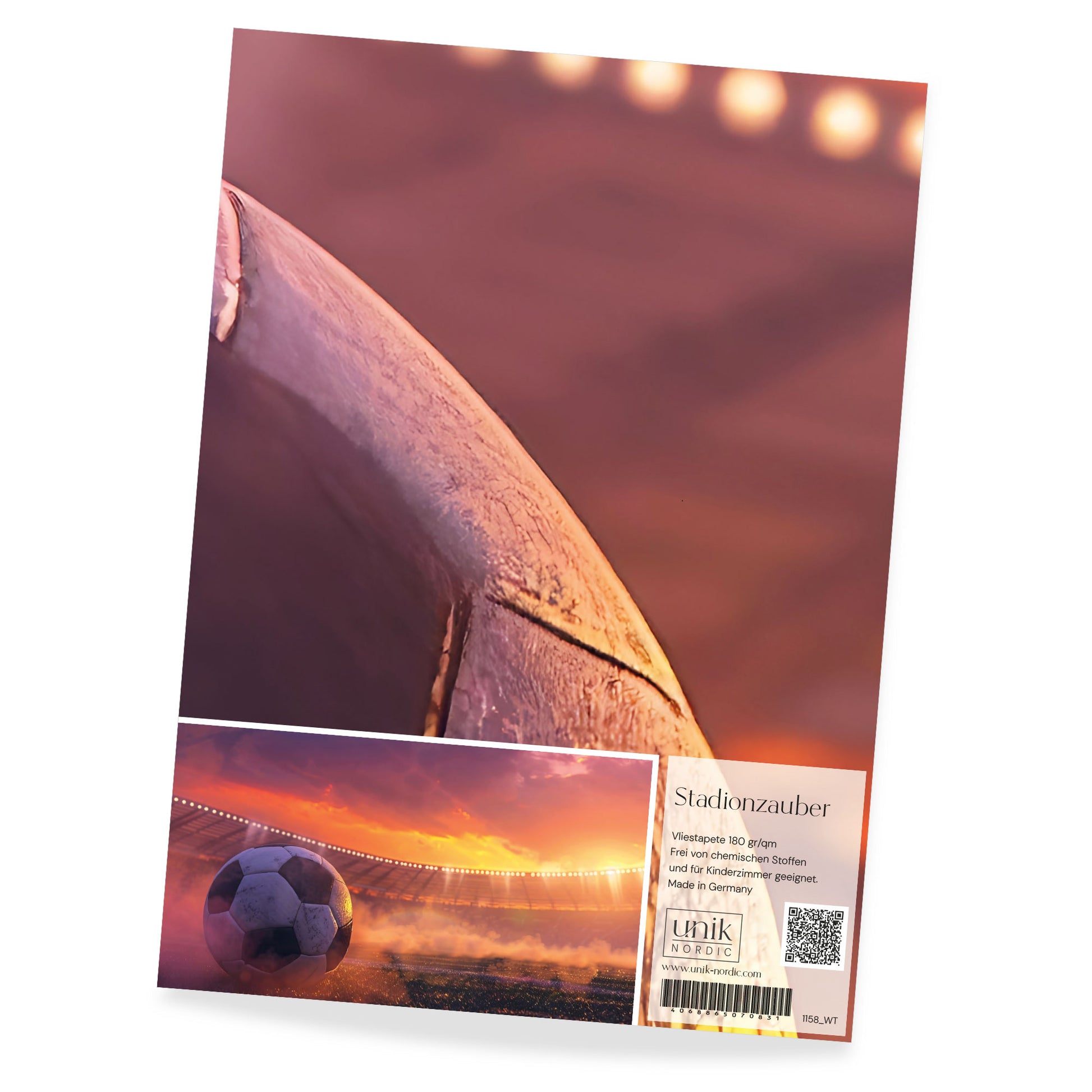 Das ist eine Materialprobe für Kindertapete Stadionzauber, damit du dich in Ruhe von der Qualität und dem hochwertigen Druck überzeugen kannst.
