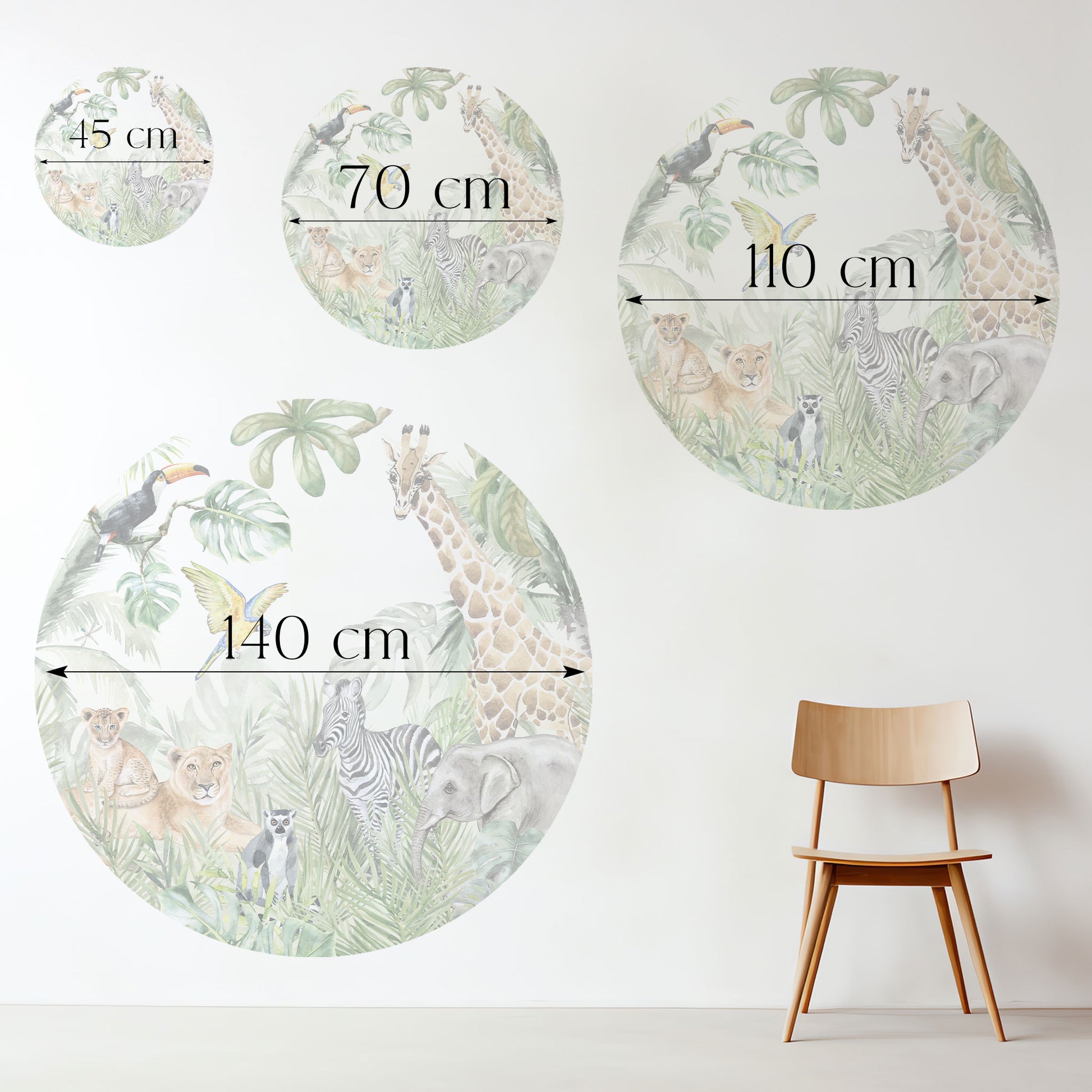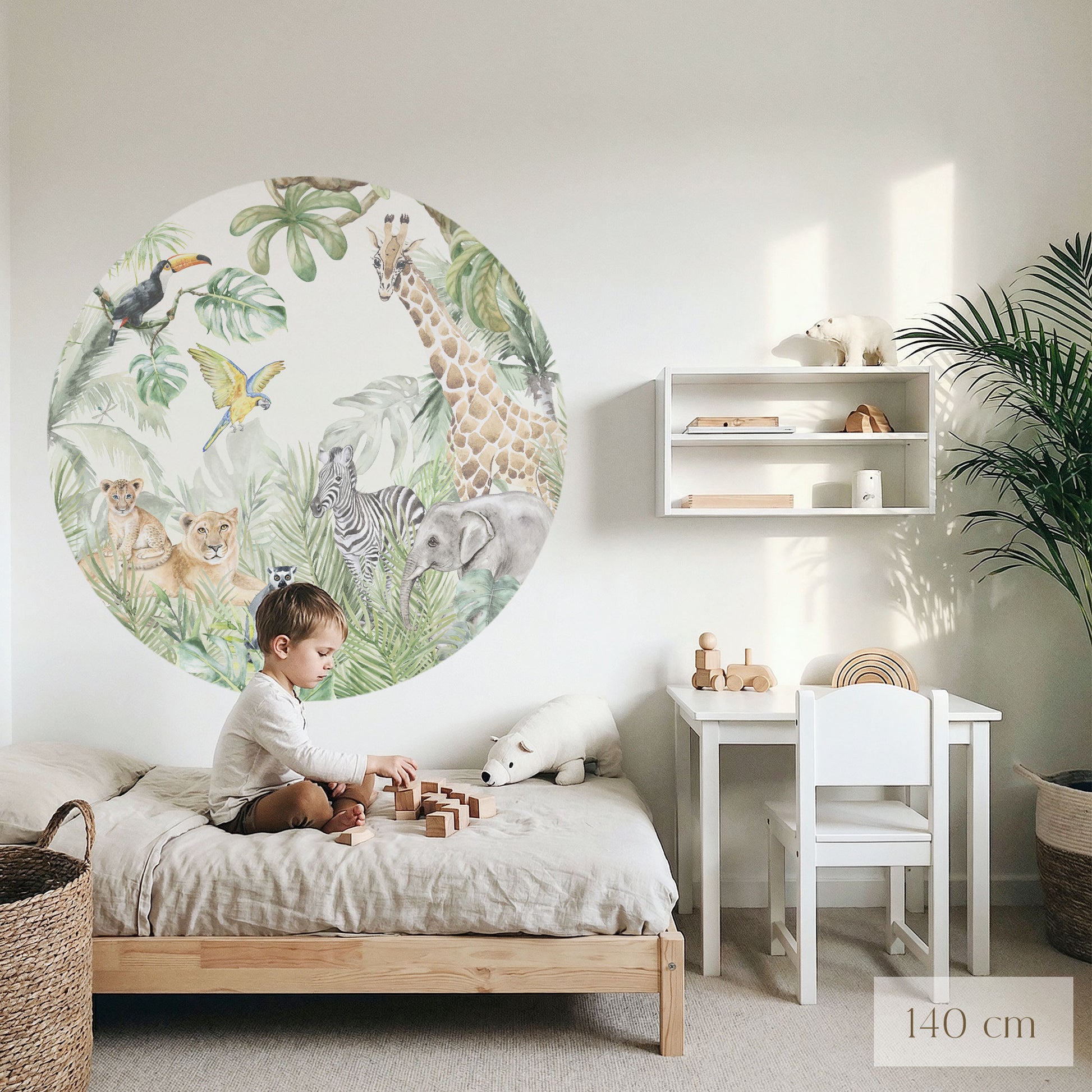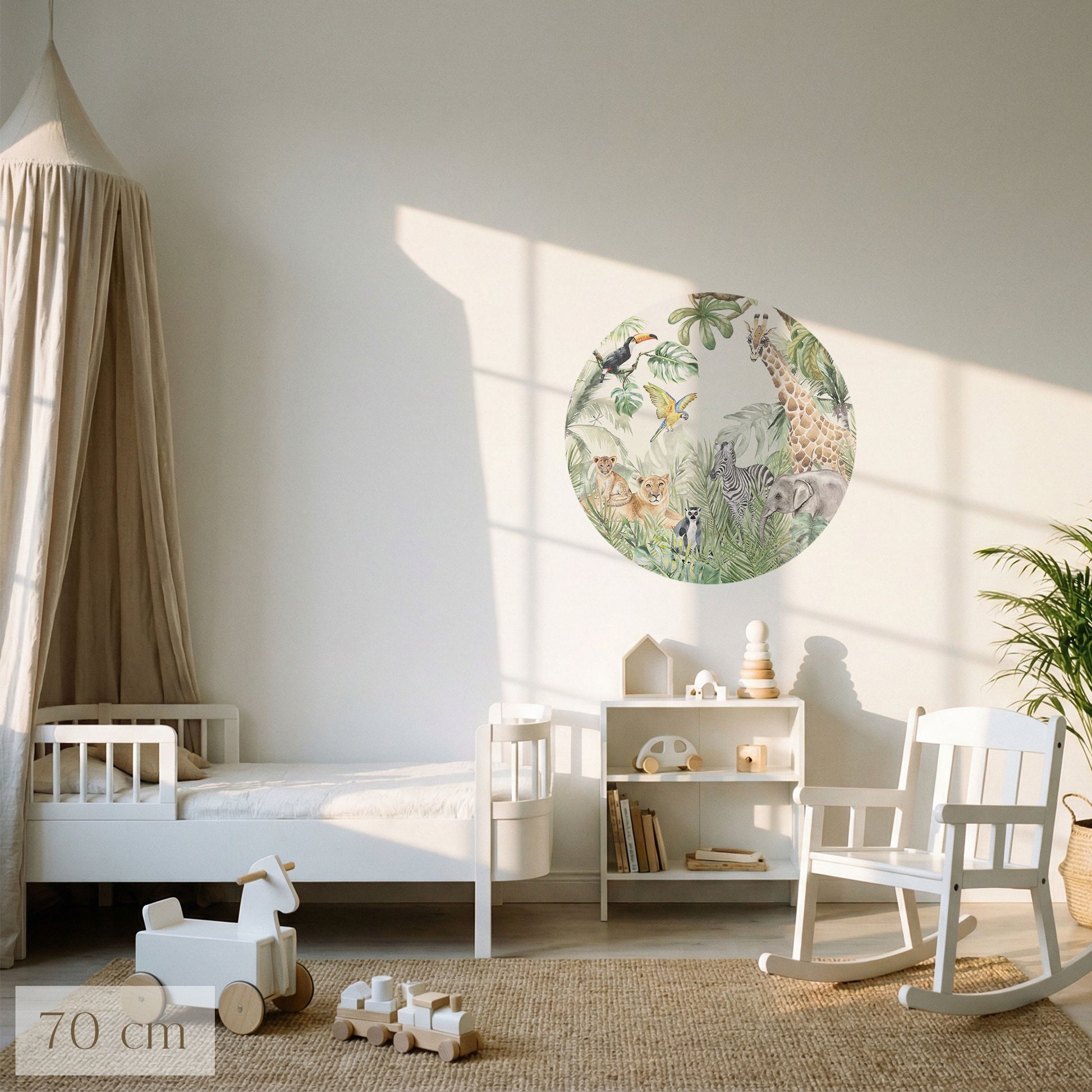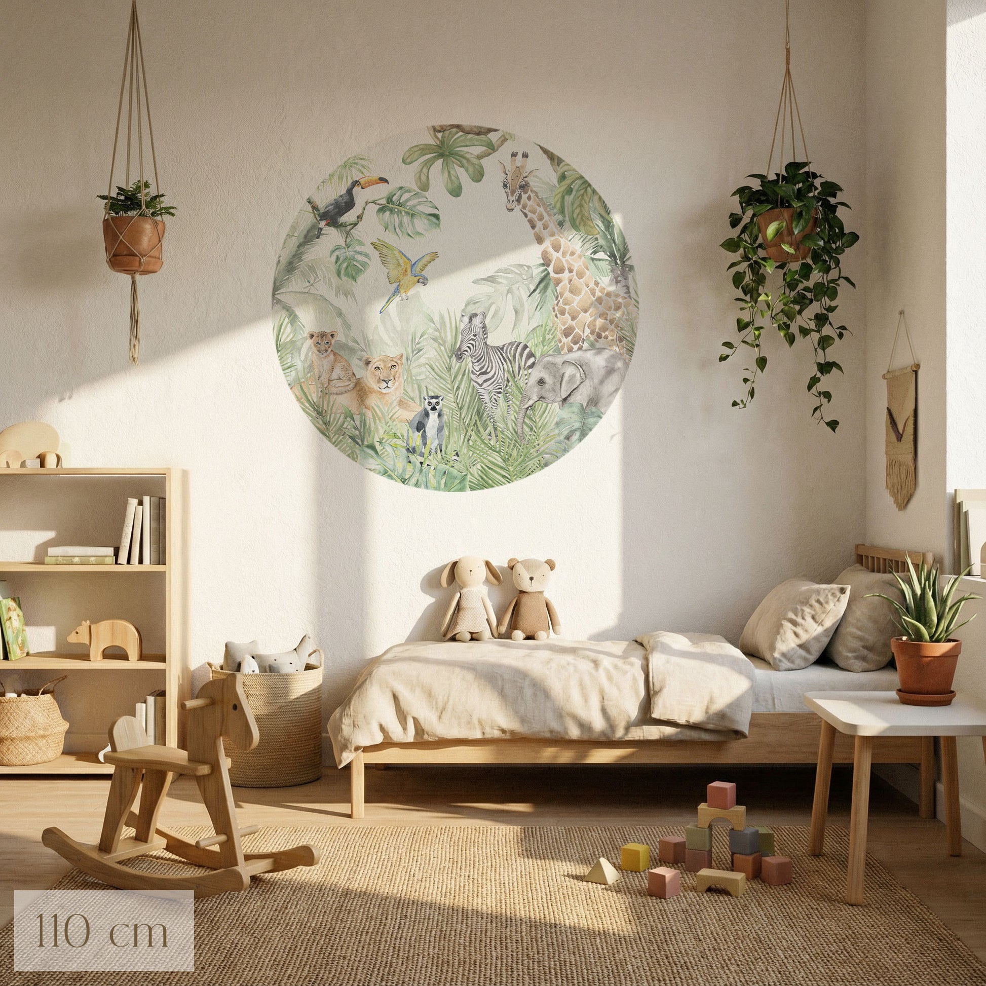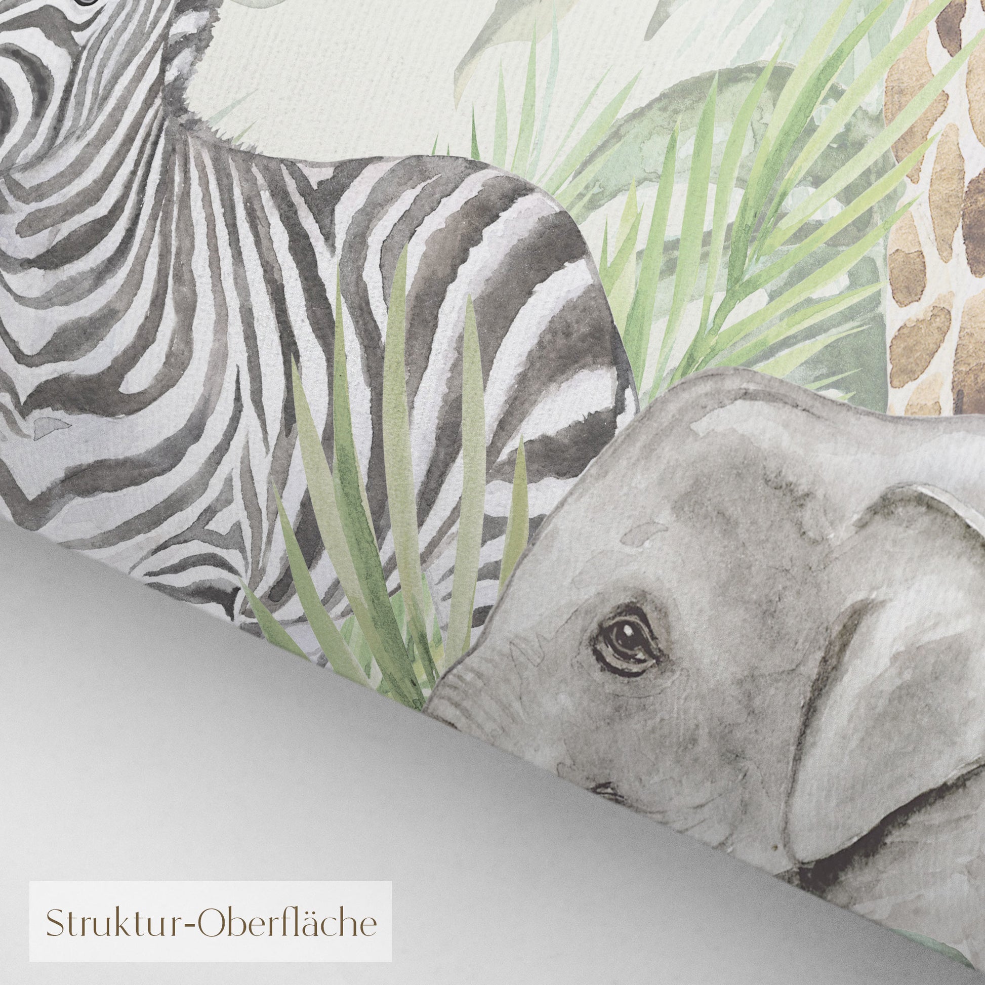 Der Tapetenkreis „Dschungeltiere“ bringt die ruhige Magie der afrikanischen Tierwelt ins Kinderzimmer. Zwischen sanften Grüntönen und zarten Blättern zeigen sich Giraffe, Zebra, Elefant und Löwe in einer liebevoll illustrierten Szene, die Wärme, Geborgenheit und Abenteuerlust zugleich ausstrahlt.