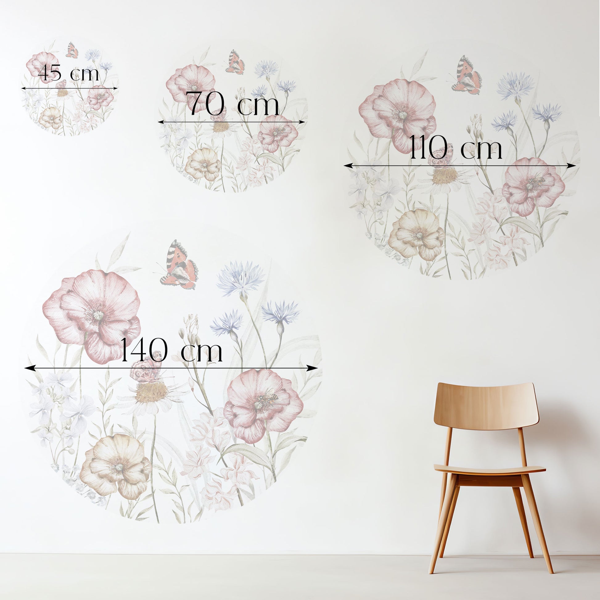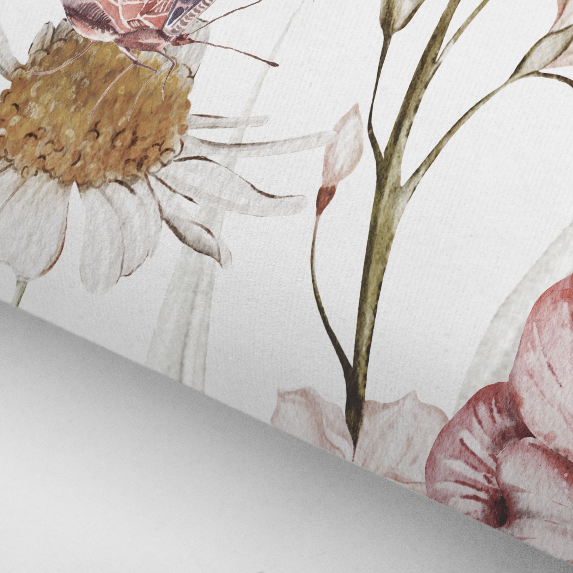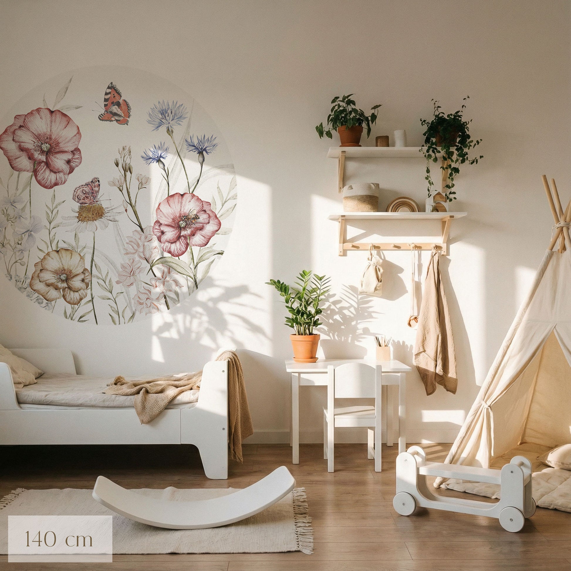 Das Motiv wirkt hell, freundlich und beruhigend zugleich. Die feinen Aquarellillustrationen schaffen eine verträumte Atmosphäre, die Raum für Fantasie lässt und das Kinderzimmer in einen Ort der Ruhe und Geborgenheit verwandelt. Jeder Blick entdeckt neue kleine Details – von den Blütenformen bis zu den schwebenden Schmetterlingen.