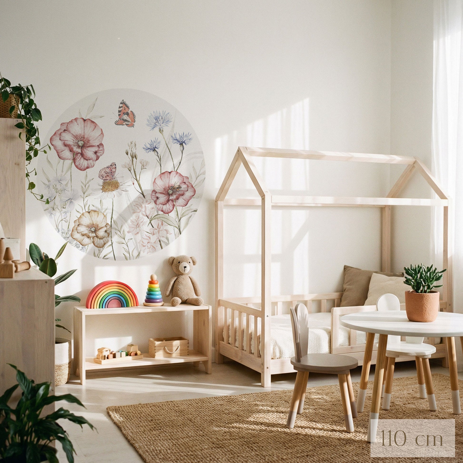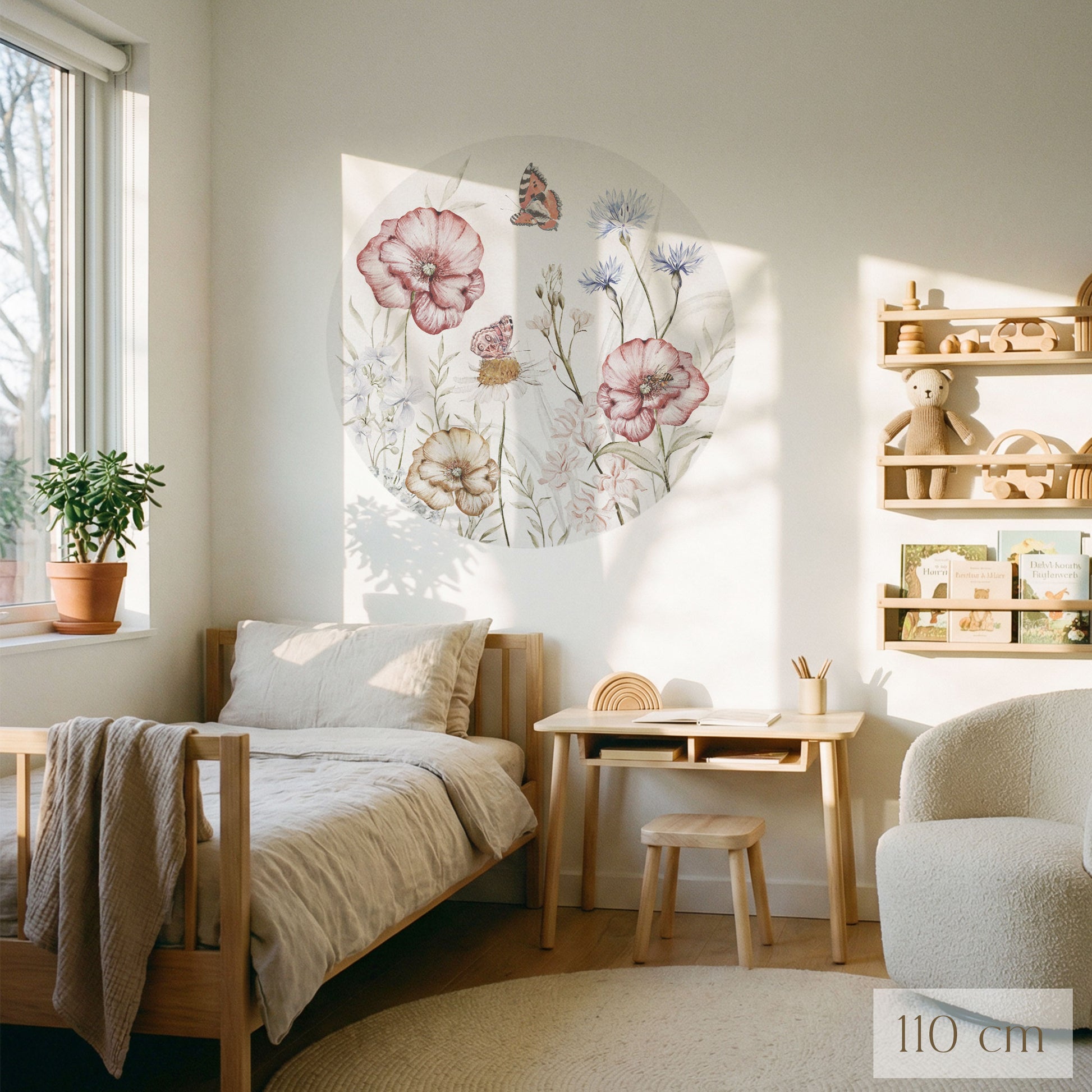 Durch das runde Format entsteht der Eindruck eines gemalten Fensters in einen stillen Garten. Der Tapetenkreis fügt sich besonders harmonisch in helle, natürliche Kinderzimmer ein und ergänzt sowohl moderne als auch klassische Einrichtungsstile.