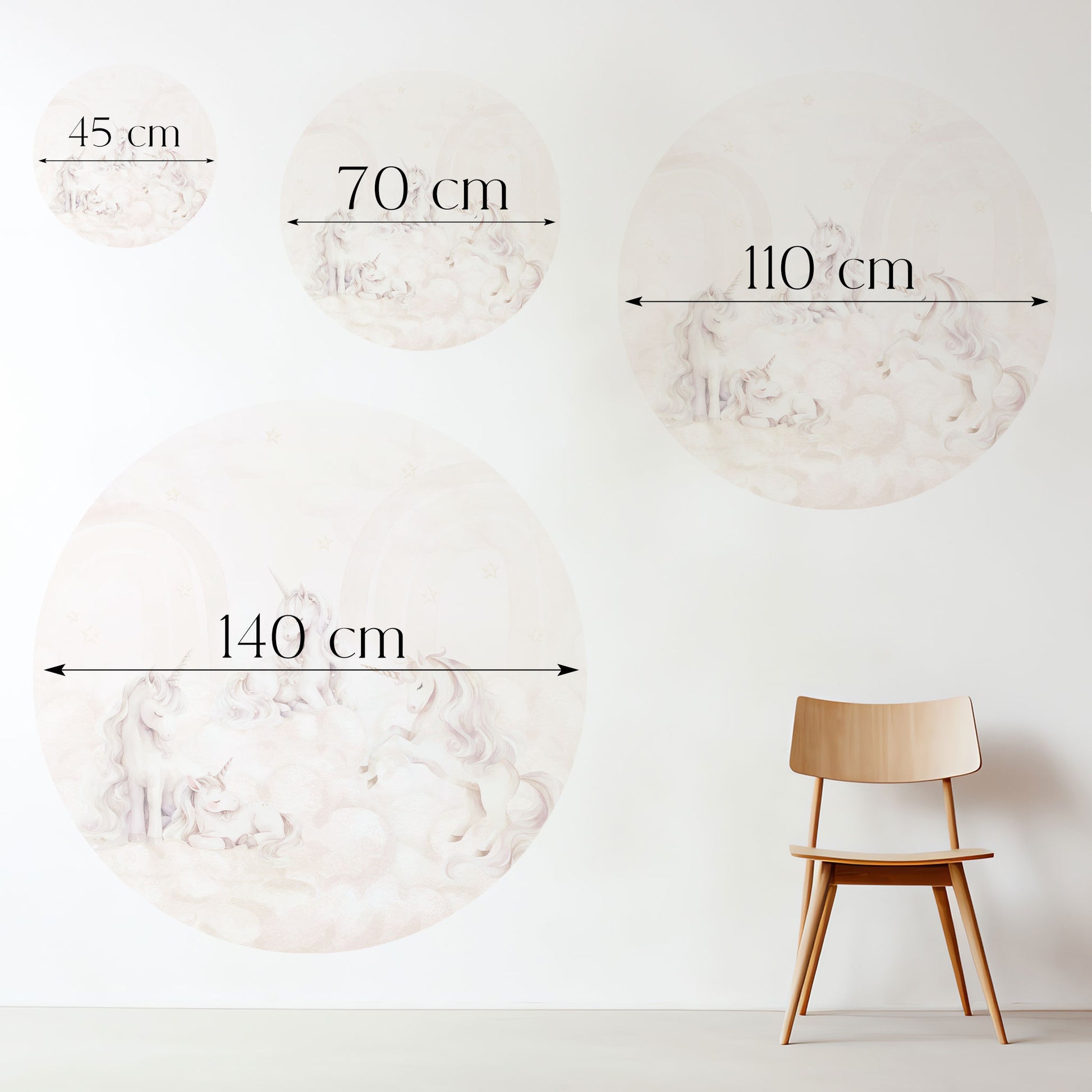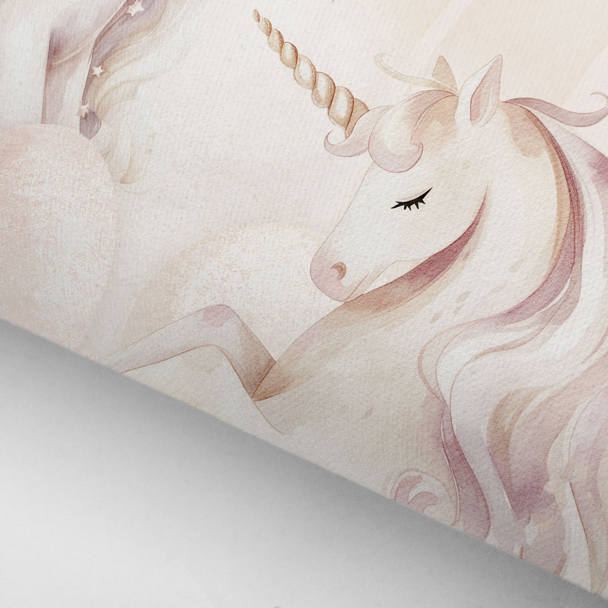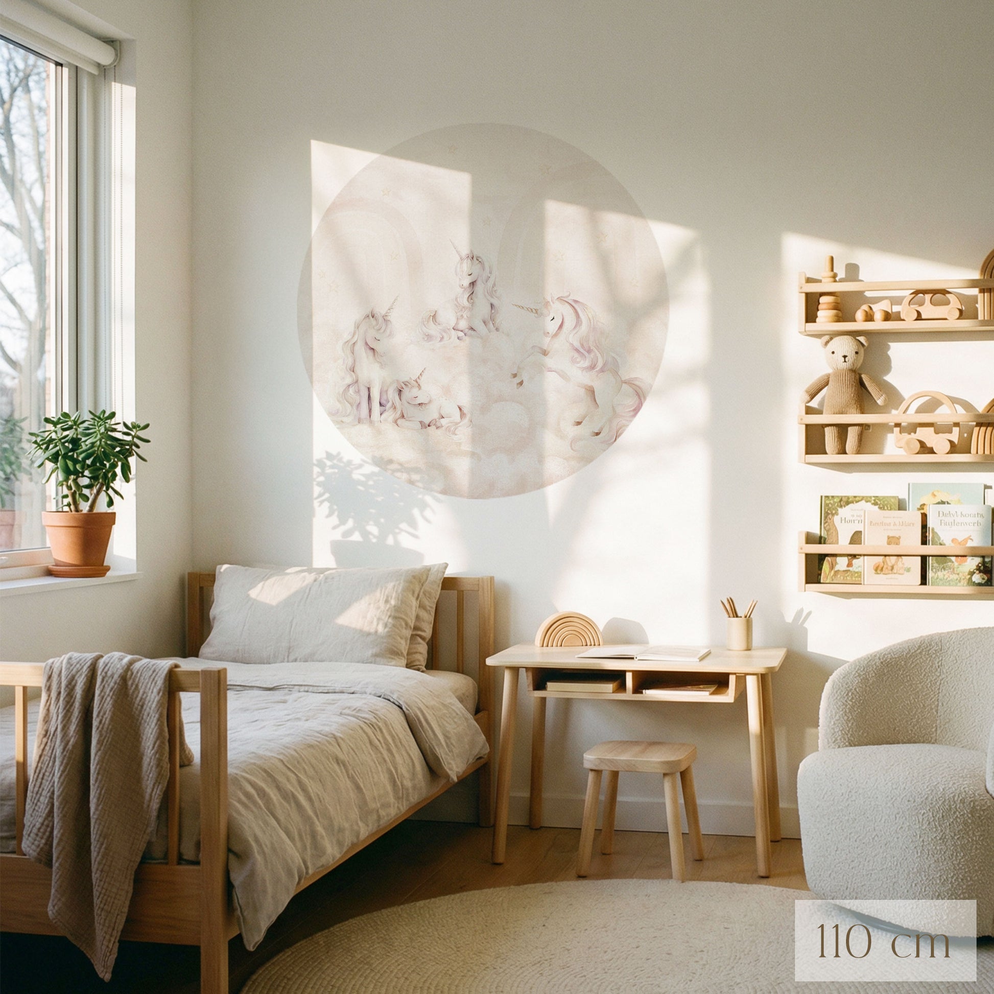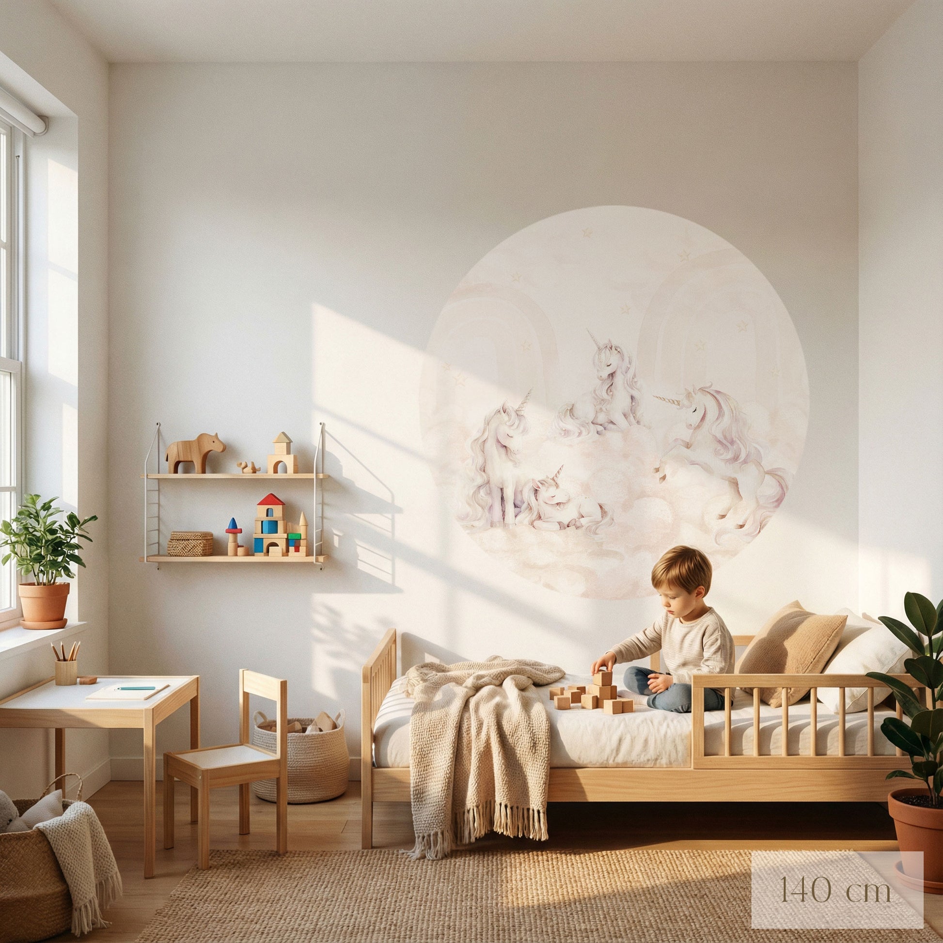 Das Motiv ist bewusst zurückhaltend gestaltet. Die soften Farben und fließenden Formen wirken beruhigend und laden zum Träumen ein, ohne den Raum zu überladen. Die Einhörner erscheinen freundlich und ruhig – perfekt für Kinderzimmer, in denen Harmonie und Wärme im Vordergrund stehen.