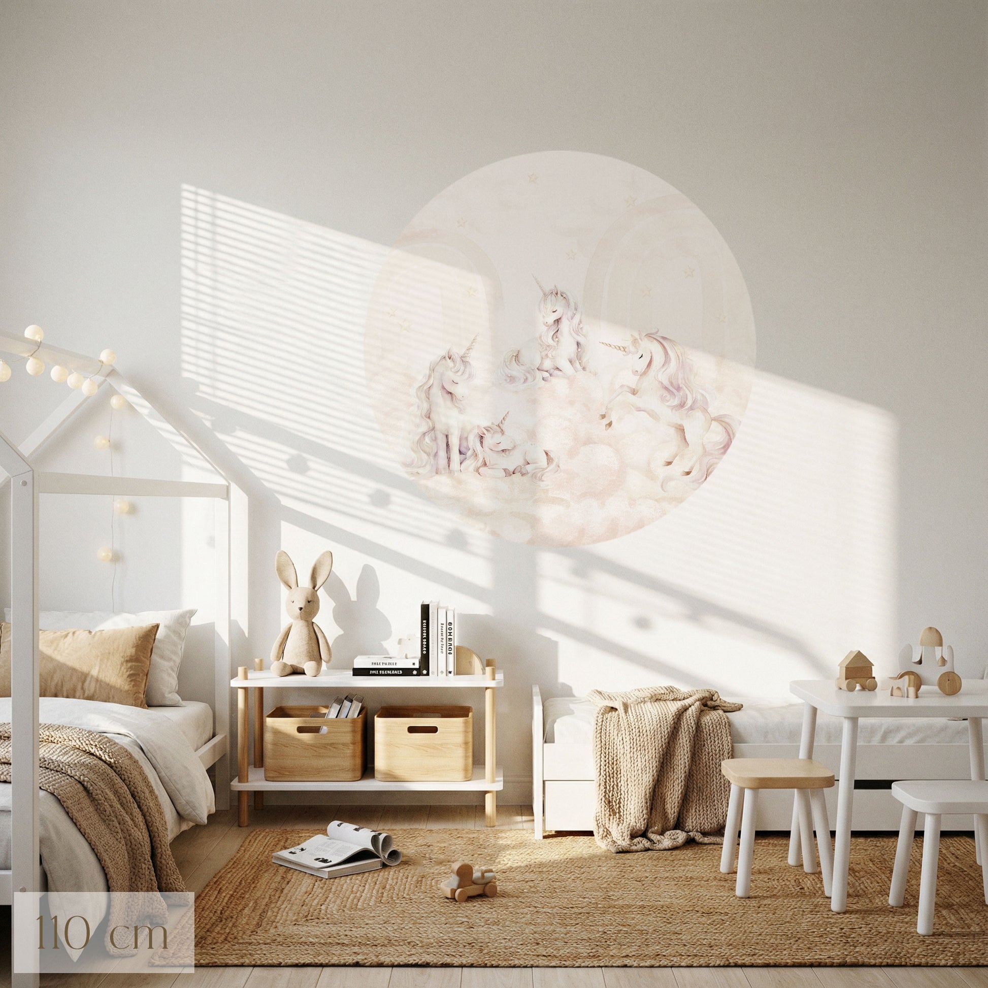 Durch das runde Format wirkt der Tapetenkreis wie ein gemaltes Fenster in eine Traumwelt. Er setzt einen sanften Akzent an der Wand und fügt sich harmonisch in helle, natürliche Kinderzimmer ein.