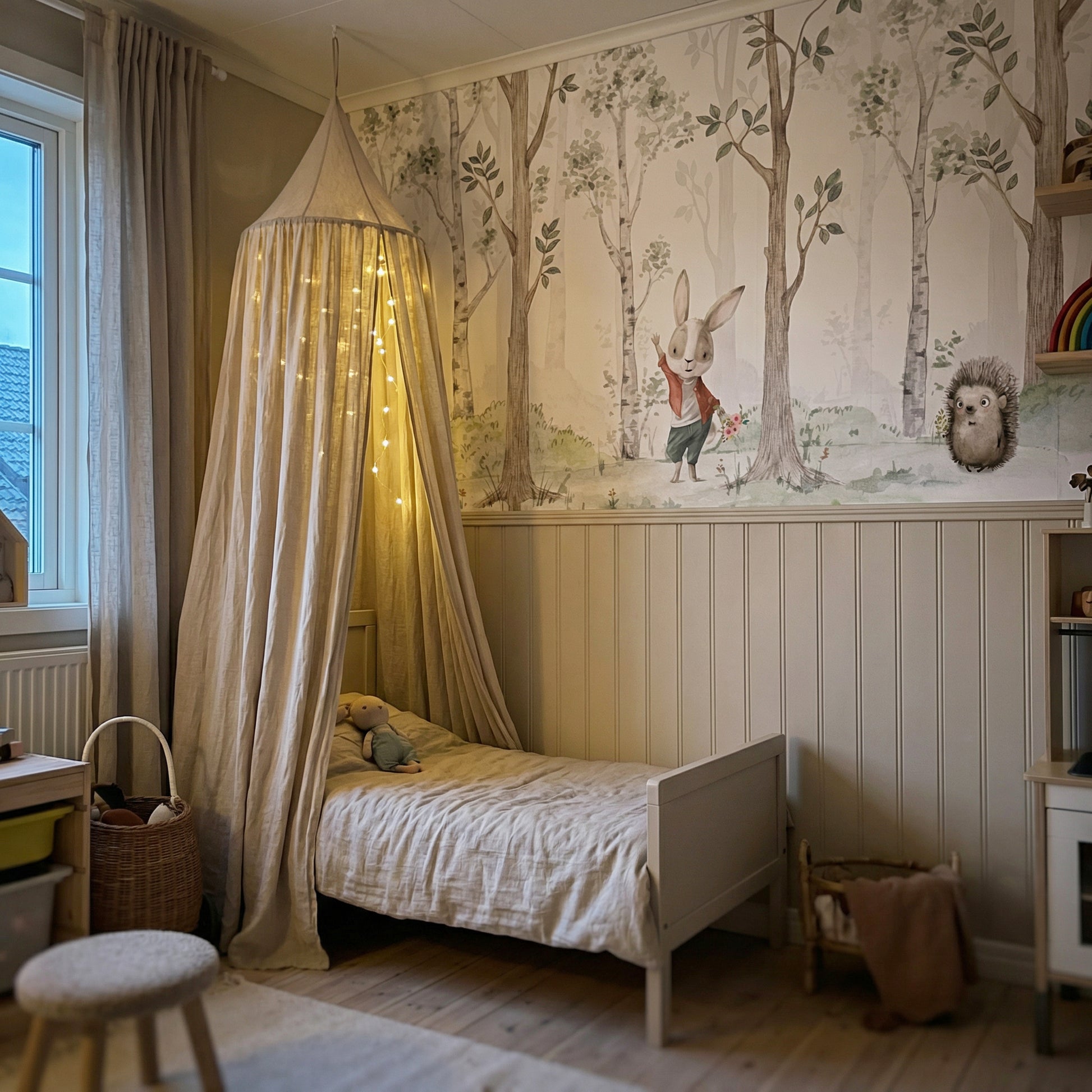 Papier peint intissé haut de gamme Unik Nordic Papier peint enfant forêt de bouleaux aquarelle avec des lapins