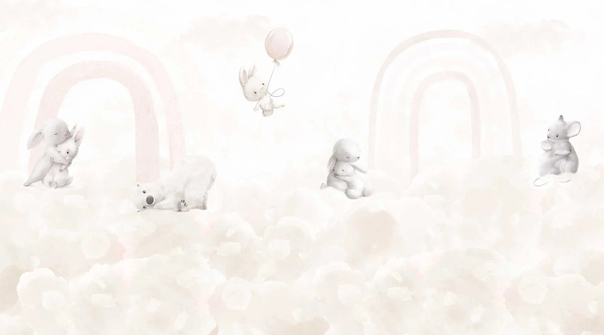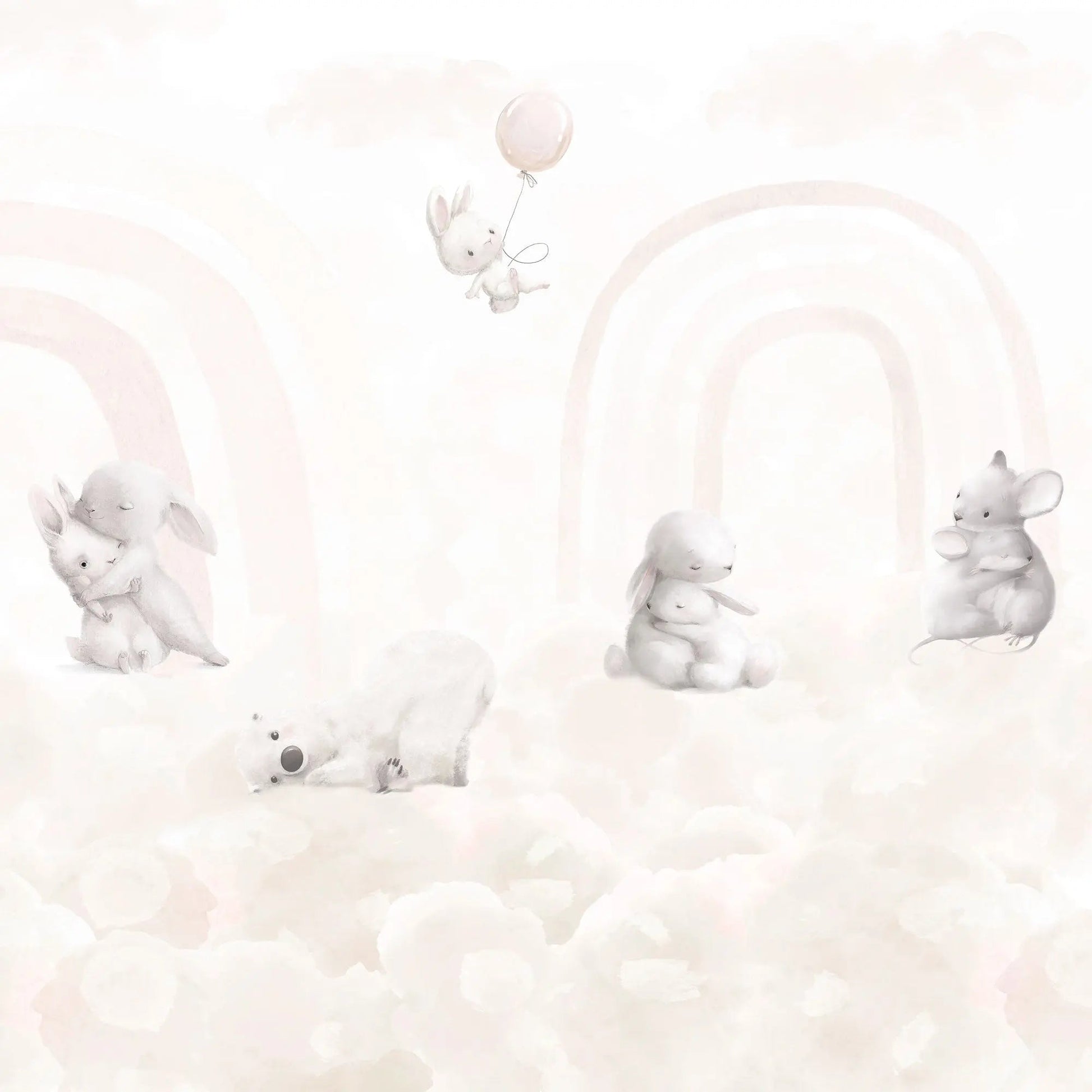 Transformez la chambre de votre enfant en un doux paradis nuageux grâce à notre papier peint conçu avec amour. De délicats tons pastel et d'adorables animaux créent une atmosphère apaisante où votre enfant se sentira comme chez lui. Un petit ours blanc trône au centre, entouré d'une souris grise curieuse et de deux lapins qui se serrent tendrement dans leurs bras. Un troisième lapin flotte joyeusement dans les airs avec un ballon rose. De doux arcs-en-ciel en arrière-plan complètent l'harmonie de l'ensemble. Ce papier peint apporte non seulement de la joie à la chambre, mais aussi un sentiment de sécurité. Parfait pour les petits explorateurs !