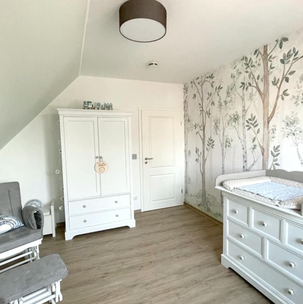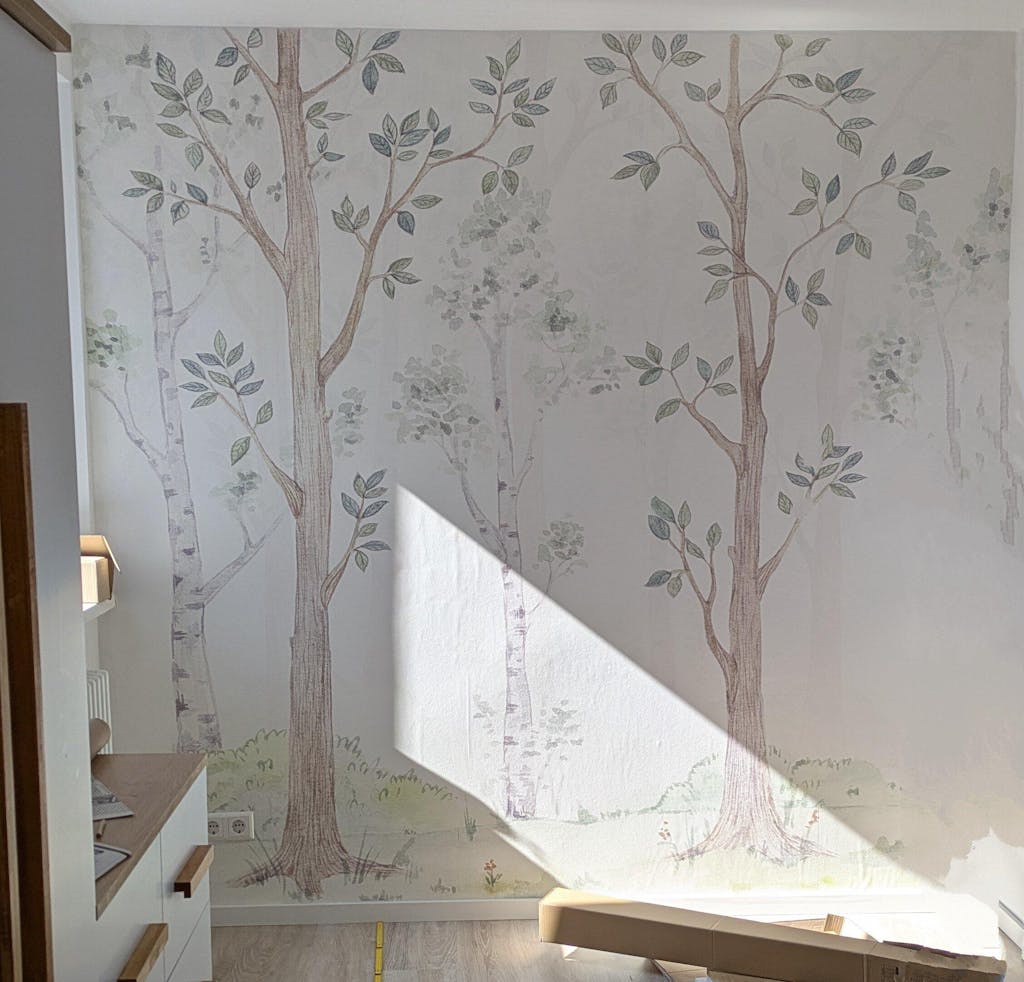 Donnez vie à la chambre de votre enfant avec une touche de nature. Notre papier peint orné de grands arbres aux tons doux de gris et de brun évoque un paysage forestier apaisant sur vos murs. Les détails délicats des troncs et les feuilles vertes délicates créent une atmosphère harmonieuse qui invite à la détente. En arrière-plan, d'autres arbres scintillent vaguement, donnant à la pièce une impression de profondeur accueillante. Le sol moelleux, agrémenté de petites plantes et d'herbes, complète le tableau et transforme la pièce en un havre de paix. Laissez la beauté naturelle s'inviter chez vous.