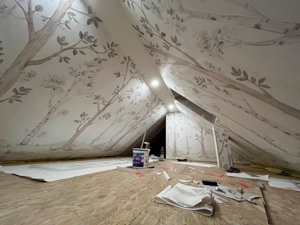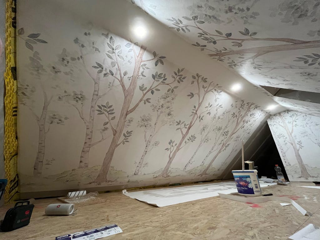 Pour les plafonds inclinés, mesurez la partie la plus large et la plus haute du mur. Le motif du papier peint est imprimé sous forme rectangulaire et la partie inclinée est ajustée lors de l'installation.