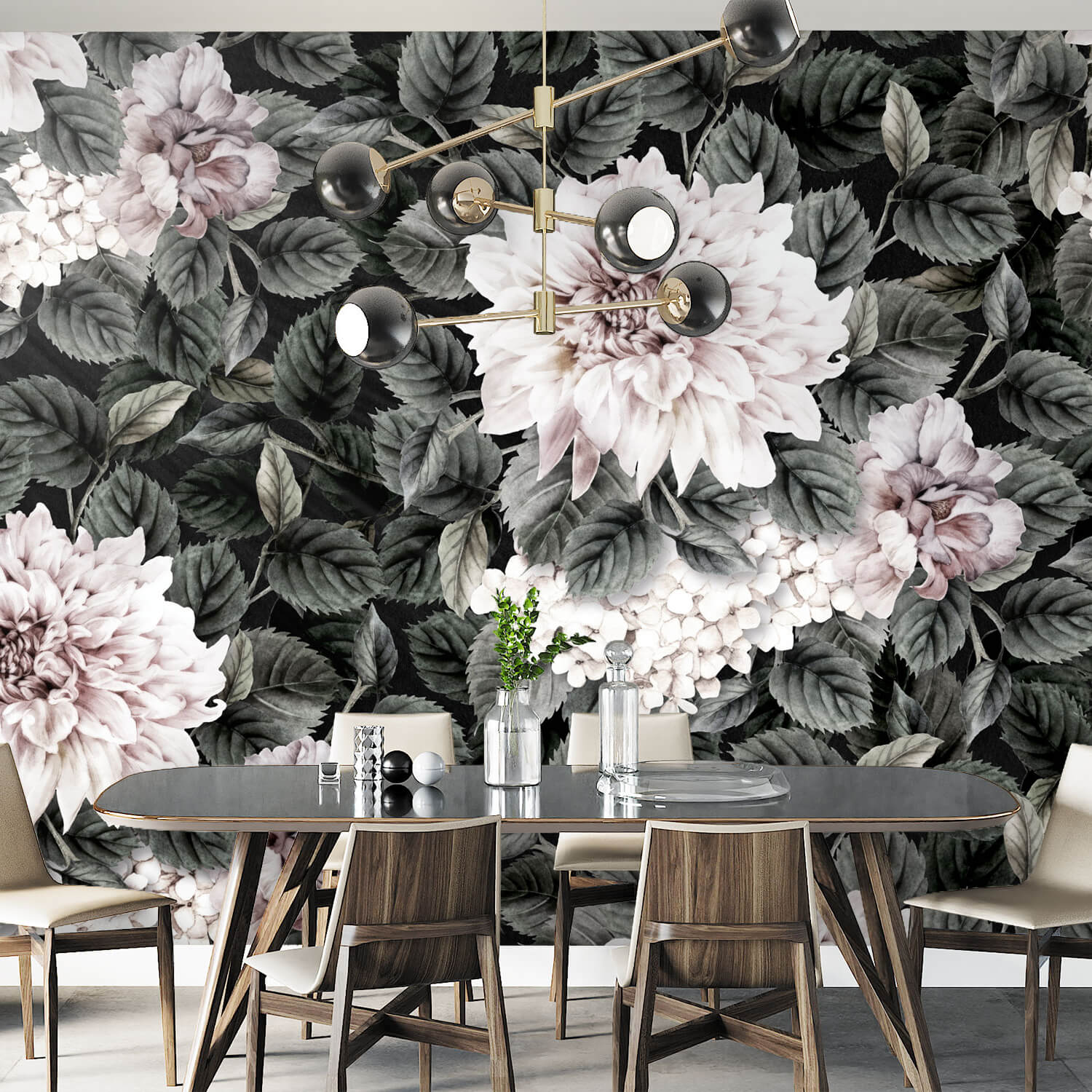 Hol dir ein Stück zeitlose Eleganz in dein Zuhause mit unserer Fototapete in sanften Grautönen und zarten Rosé-Nuancen. Die großblütigen Dahlien und kleineren Blüten strahlen auf einem dunklen Hintergrund, der ihre Leuchtkraft eindrucksvoll zur Geltung bringt. Die detaillierten grünen Blätter fügen dem Design Tiefe und Dynamik hinzu und schaffen eine harmonische Balance. Diese Tapete verwandelt jeden Raum in eine beruhigende Oase und sorgt für eine einladende Atmosphäre. Lass dich von der Schönheit der Natur inspirieren und gestalte deine Wände so einzigartig, wie du es bist.