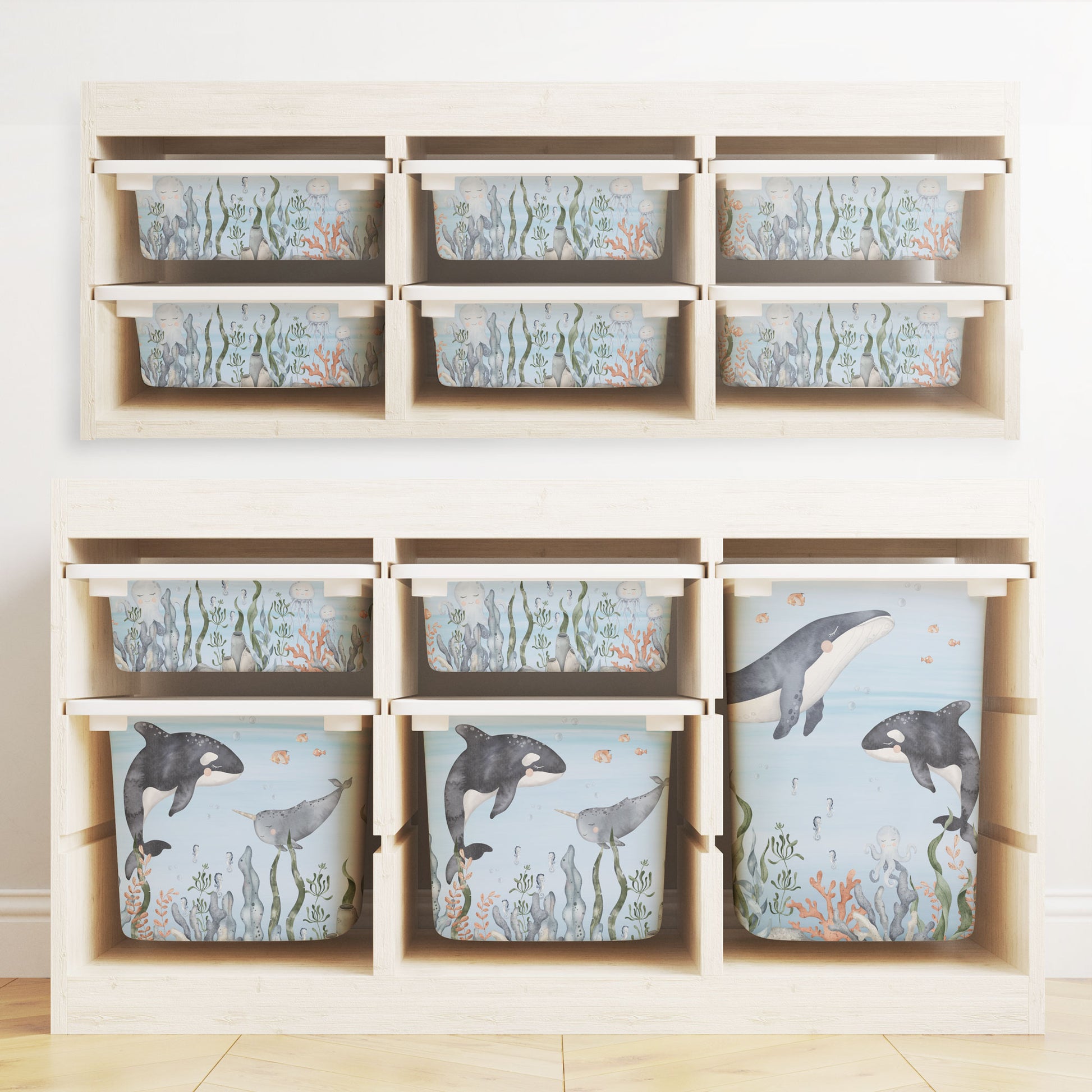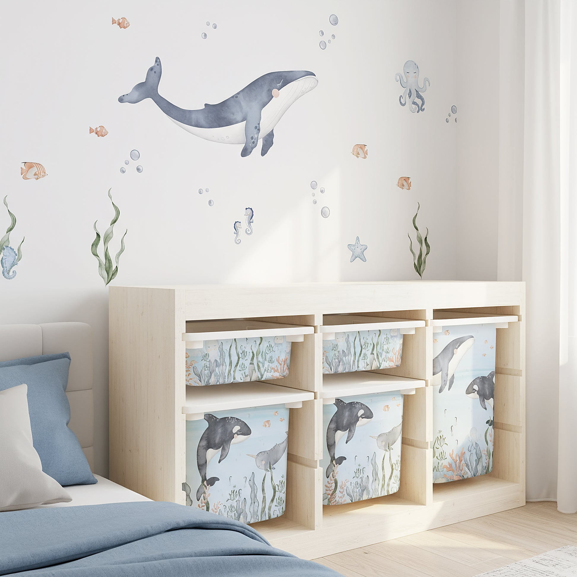 Unsere Möbelfolie „Meeresboden“ zeigt liebevoll illustrierte Wale, Orcas, Quallen und kleine Seepferdchen, die zwischen Seegras und Korallen sanft durchs Wasser gleiten. Das dezente Aquarelldesign in Blau-, Grau- und Sandtönen bringt maritime Leichtigkeit ins Kinderzimmer – ideal für kleine Meeresfreunde.