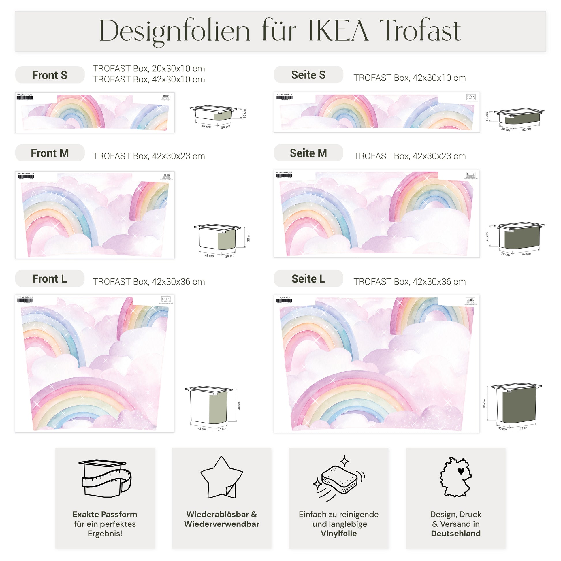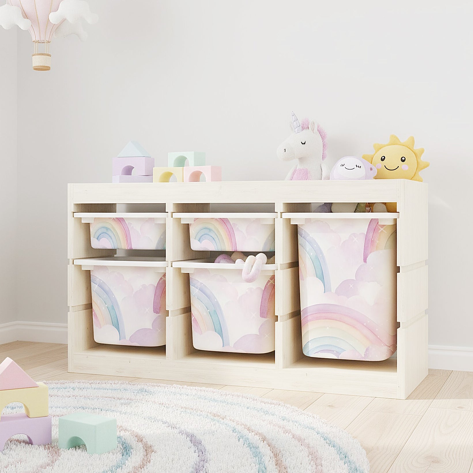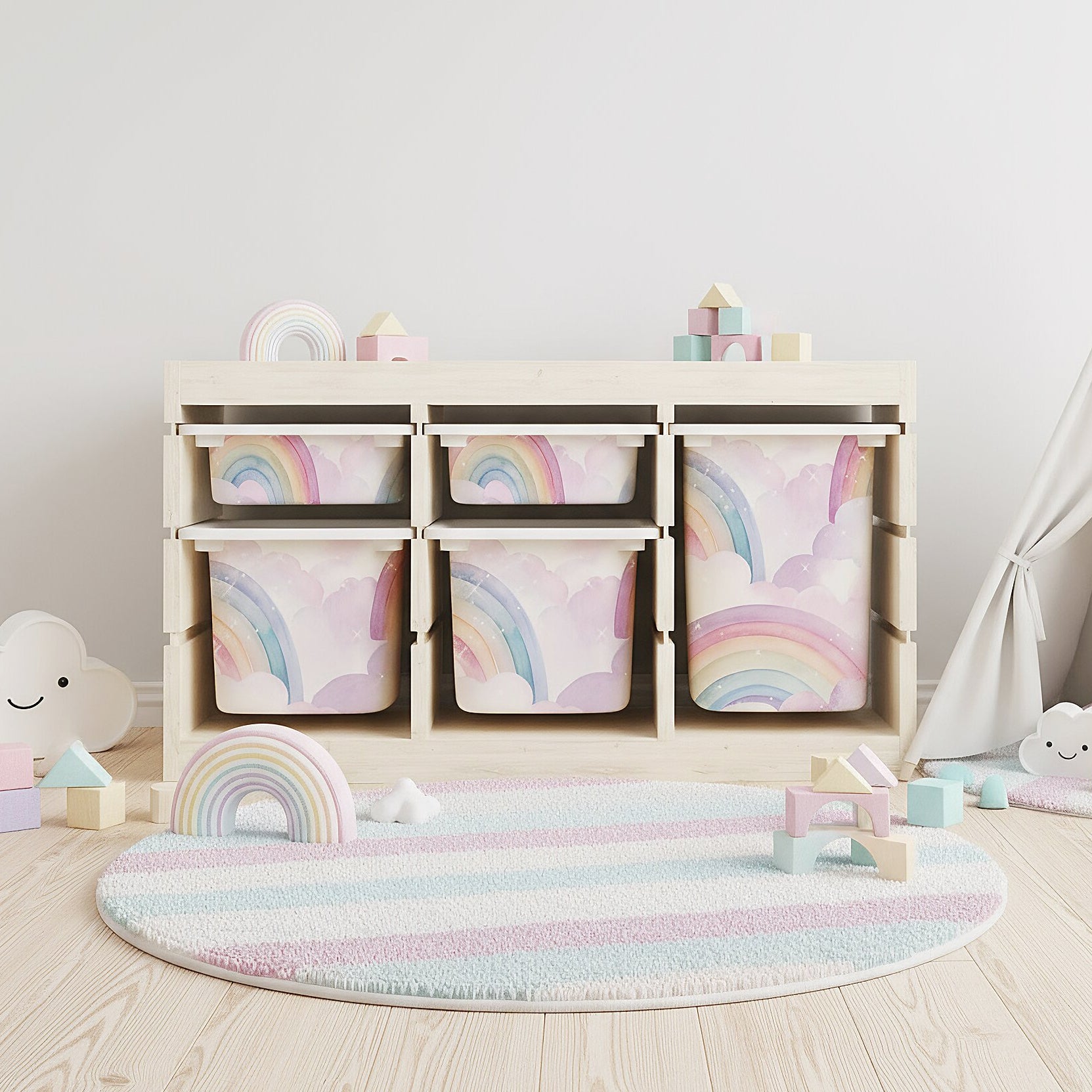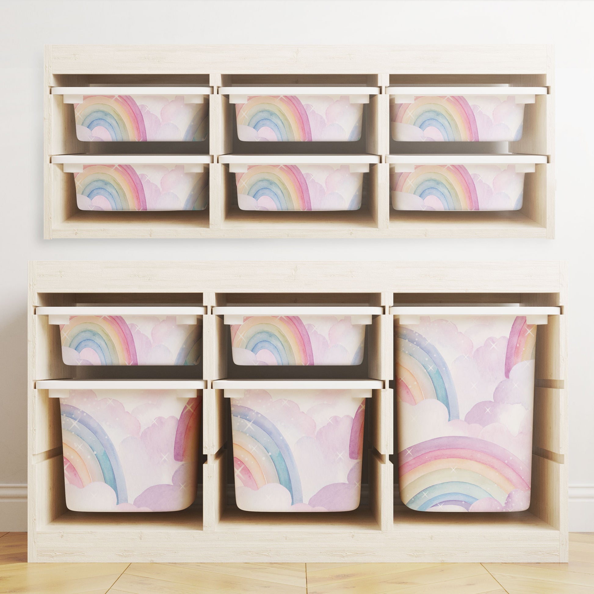 Unsere liebevoll gestalteten Sticker im Aquarellstil verwandeln einfache IKEA TROFAST Boxen in ein traumhaftes Highlight. Zarte Pastell-Regenbögen und fluffige Wolken sorgen sofort für gute Laune und machen aus jeder Aufbewahrung ein kleines Kunstwerk.