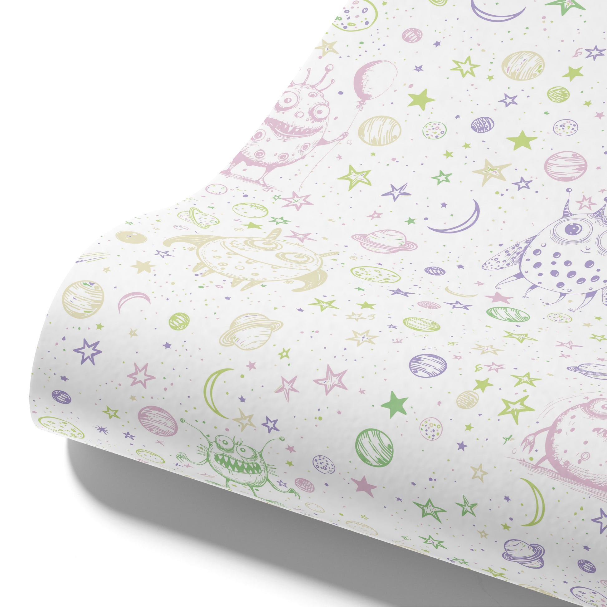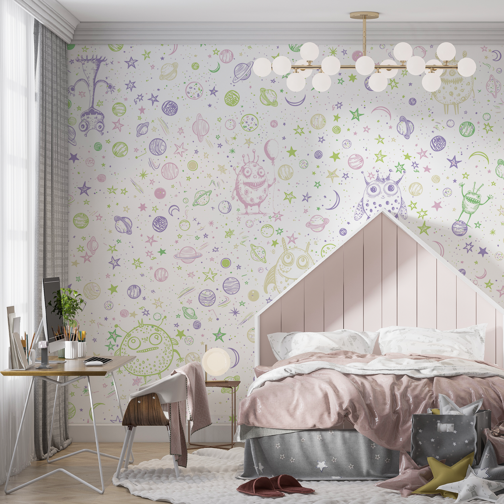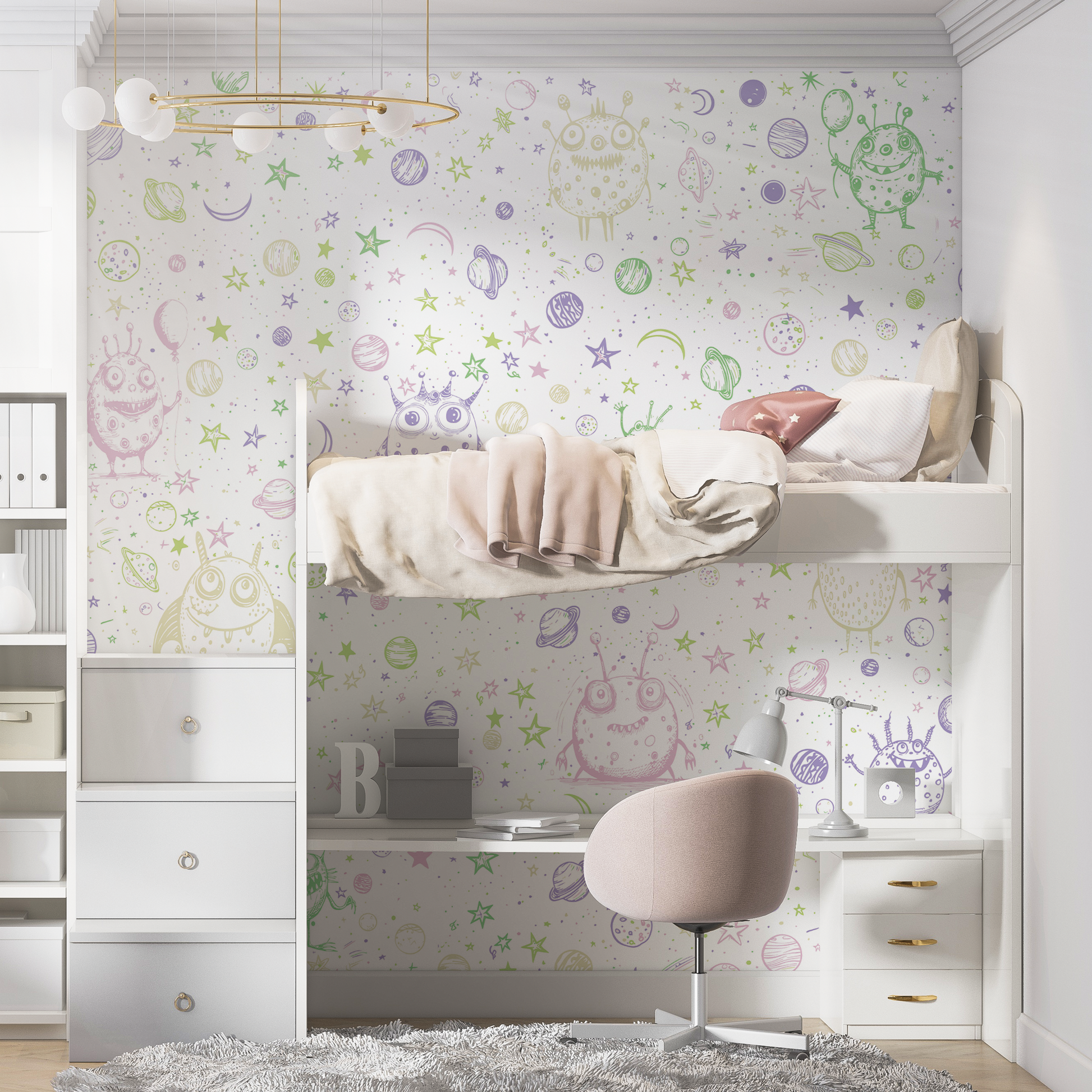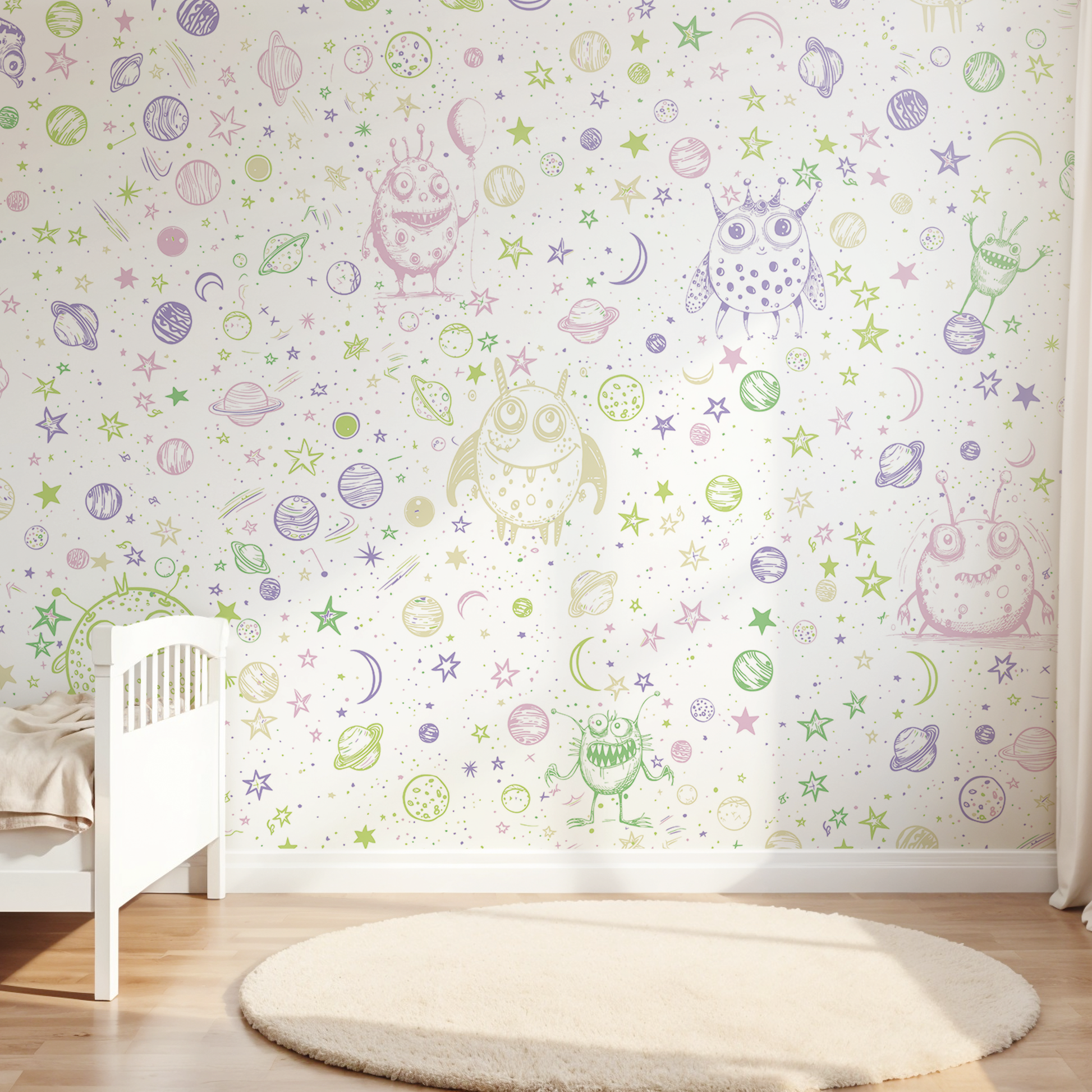 Mit dieser fröhlichen Kindertapete zieht ein ganzer Kosmos voller lustiger Monster, bunter Sterne und Planeten ins Kinderzimmer ein. Die sanften Pastellfarben und die verspielten Zeichnungen schaffen eine fantasievolle Atmosphäre, die zum Träumen, Spielen und Entdecken einlädt. Ob als komplette Wandgestaltung oder als liebevoller Akzent – diese Tapete bringt gute Laune, Abenteuerlust und ein Stück Weltraum in jedes Kinderzimmer. Passend dazu finden Sie in unserem Shop auch Folien für IKEA Malm Kommoden und Kura Betten im gleichen Design.