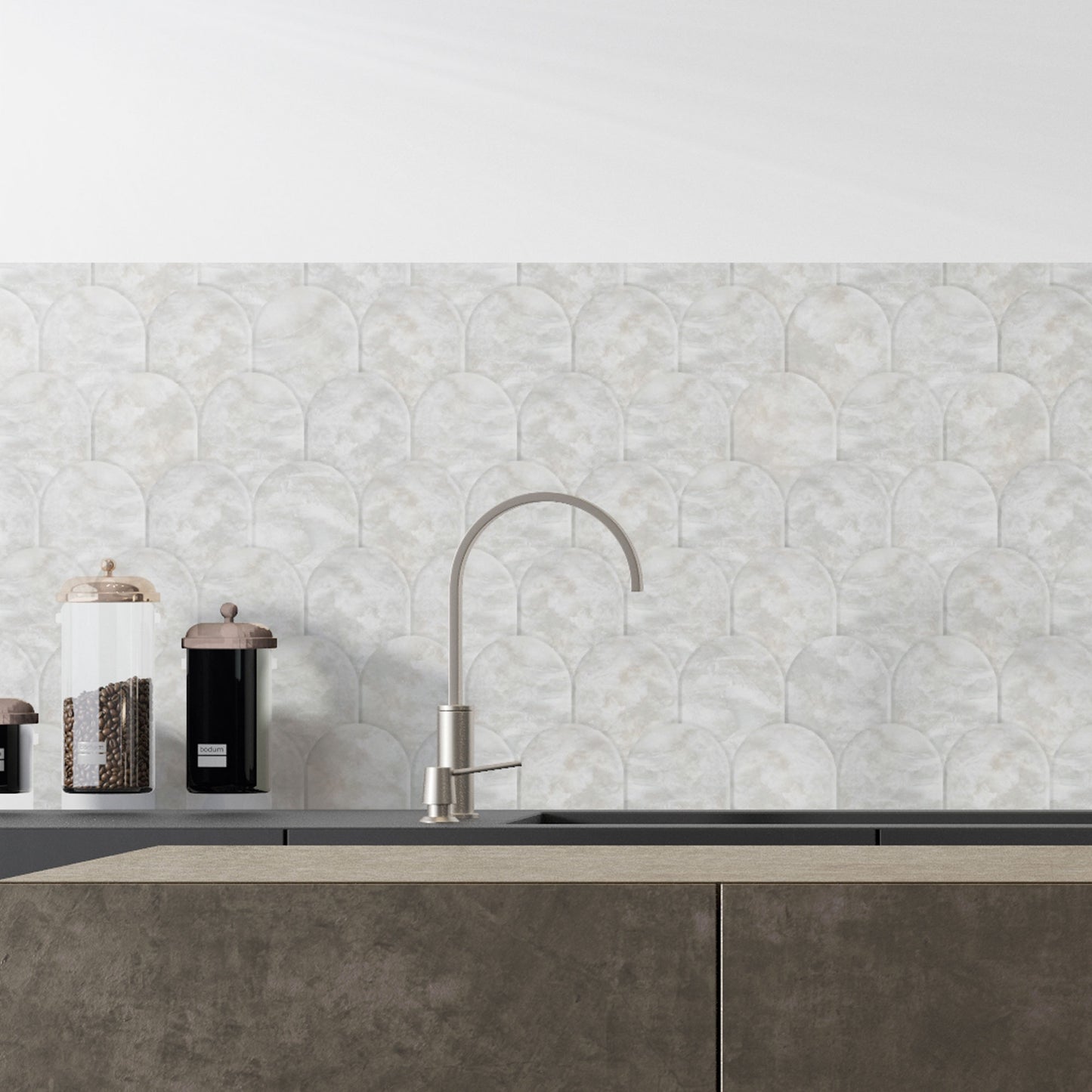 Bring mit unserer Küchenfolie eine elegante und beruhigende Atmosphäre in dein Zuhause. Die sanften, halbkreisförmigen Elemente in Grau und Weiß erinnern an die natürliche Schönheit von Marmor und fügen sich nahtlos in einen minimalistischen oder skandinavischen Einrichtungsstil ein. Die subtilen Wellen und Texturen verleihen deinem Raum eine moderne und harmonische Anmutung, die Ruhe und Gelassenheit ausstrahlt. Perfekt für alle, die ihrem Zuhause einen Hauch von Eleganz verleihen möchten, ohne aufdringlich zu wirken. Lass dein Zuhause mit diesem stilvollen Design erstrahlen und genieße die entspannte, einladende Atmosphäre.