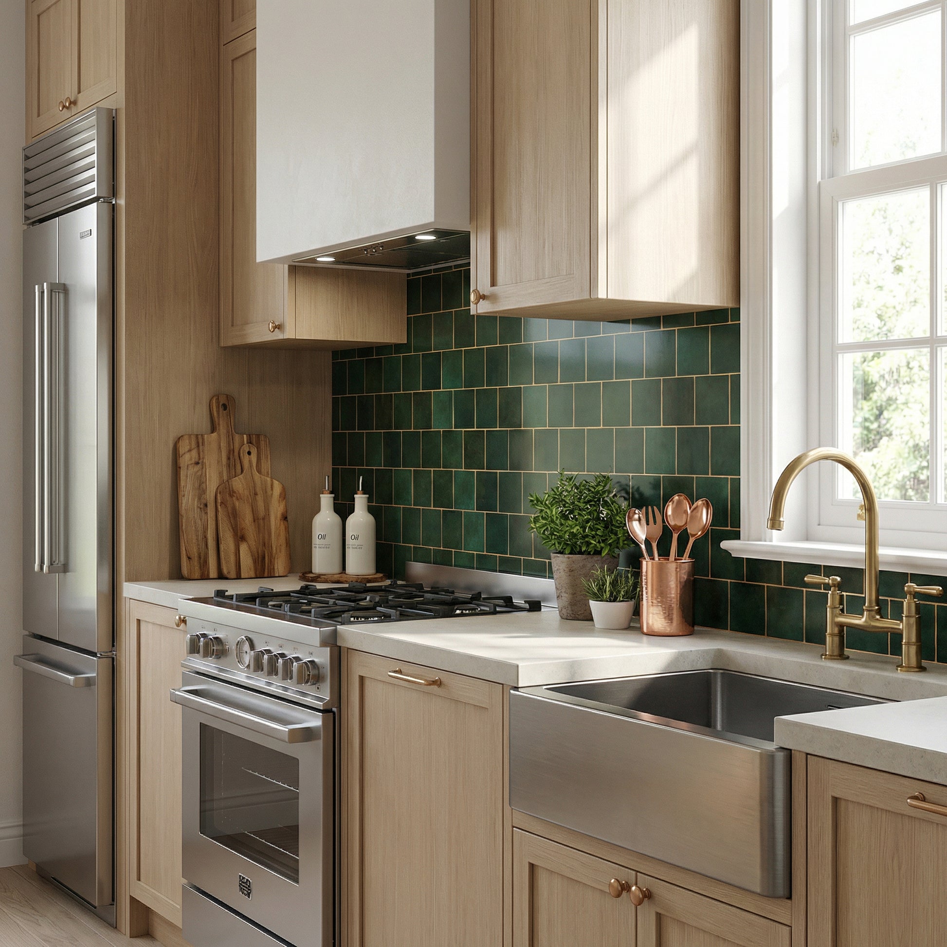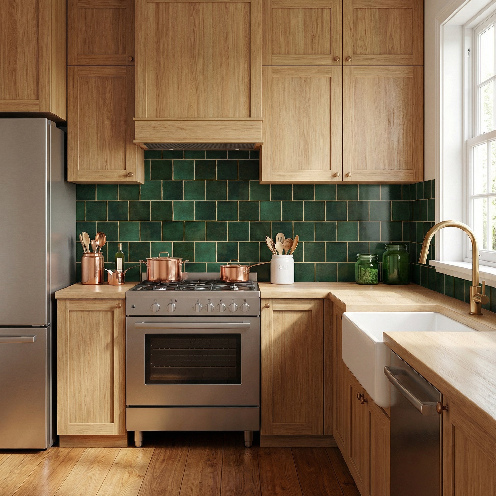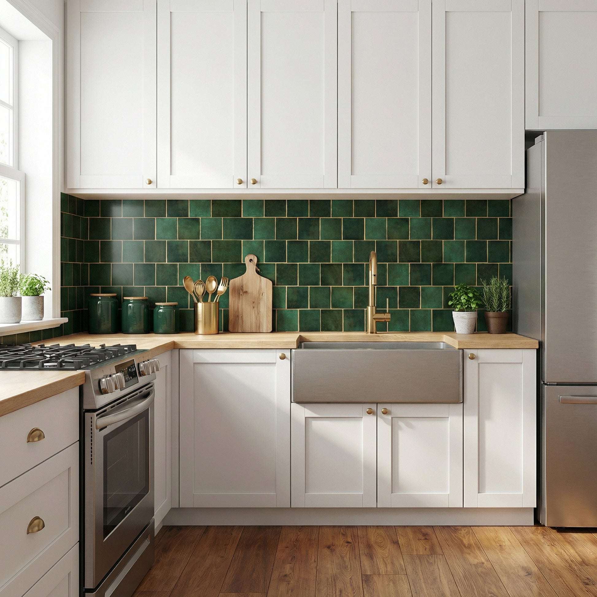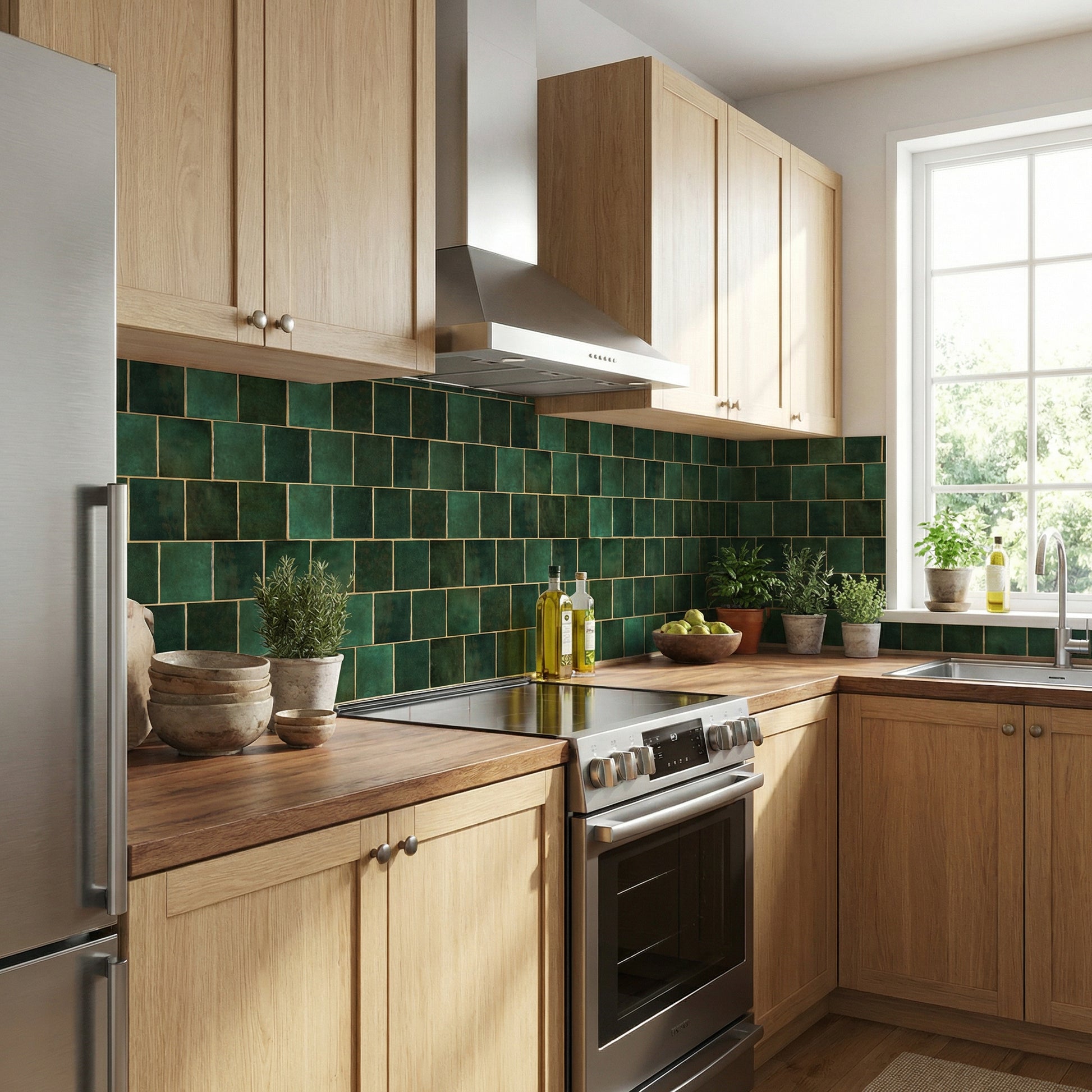 Donnez un nouveau souffle à votre cuisine avec notre papier peint en élégante mosaïque verte. Les carreaux rectangulaires déclinés dans différentes nuances de vert, allant du vert profond et saturé aux nuances claires rappelant le cuivre patiné, créent une atmosphère harmonieuse et vibrante. Le mélange de surfaces mates et légèrement brillantes confère au design une texture captivante, tandis que les joints clairs accentuent le contraste et mettent en valeur chaque détail. Ce papier peint est parfait pour apporter une touche naturelle et élégante à votre cuisine. Aménagez votre espace selon vos envies et profitez de l'effet apaisant de cette palette de couleurs captivante.