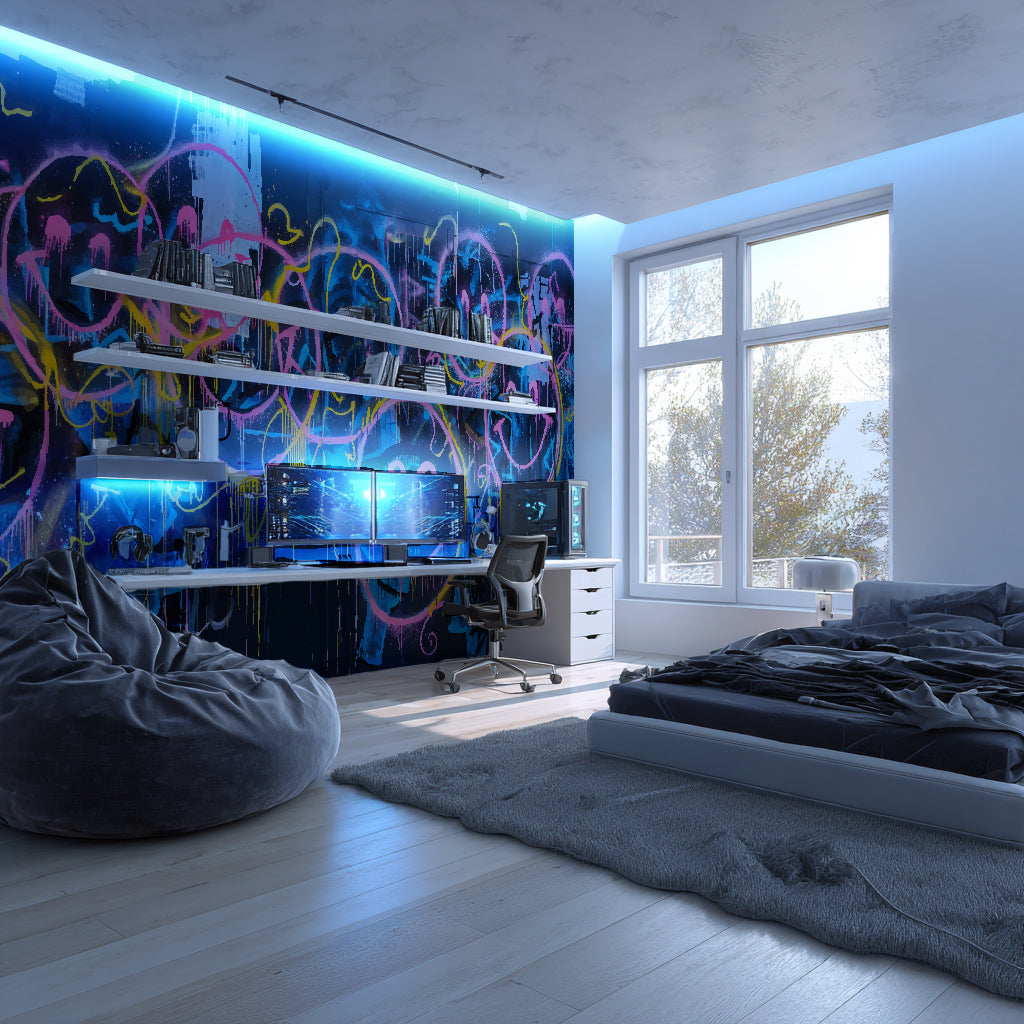 Kreative Welten für junge Räume: Streetart, Popkultur und Gaming verschmelzen zu einzigartigen Wanddesigns.