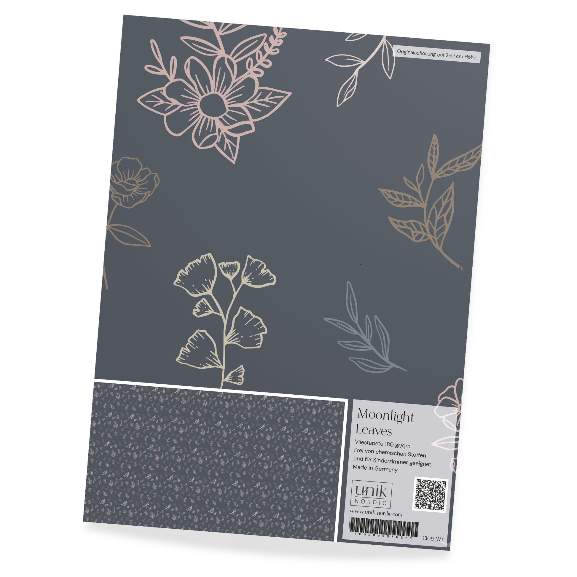 Das ist eine Materialprobe für Designtapete Moonlight Leaves, damit du dich in Ruhe von der Qualität und dem hochwertigen Druck überzeugen kannst.