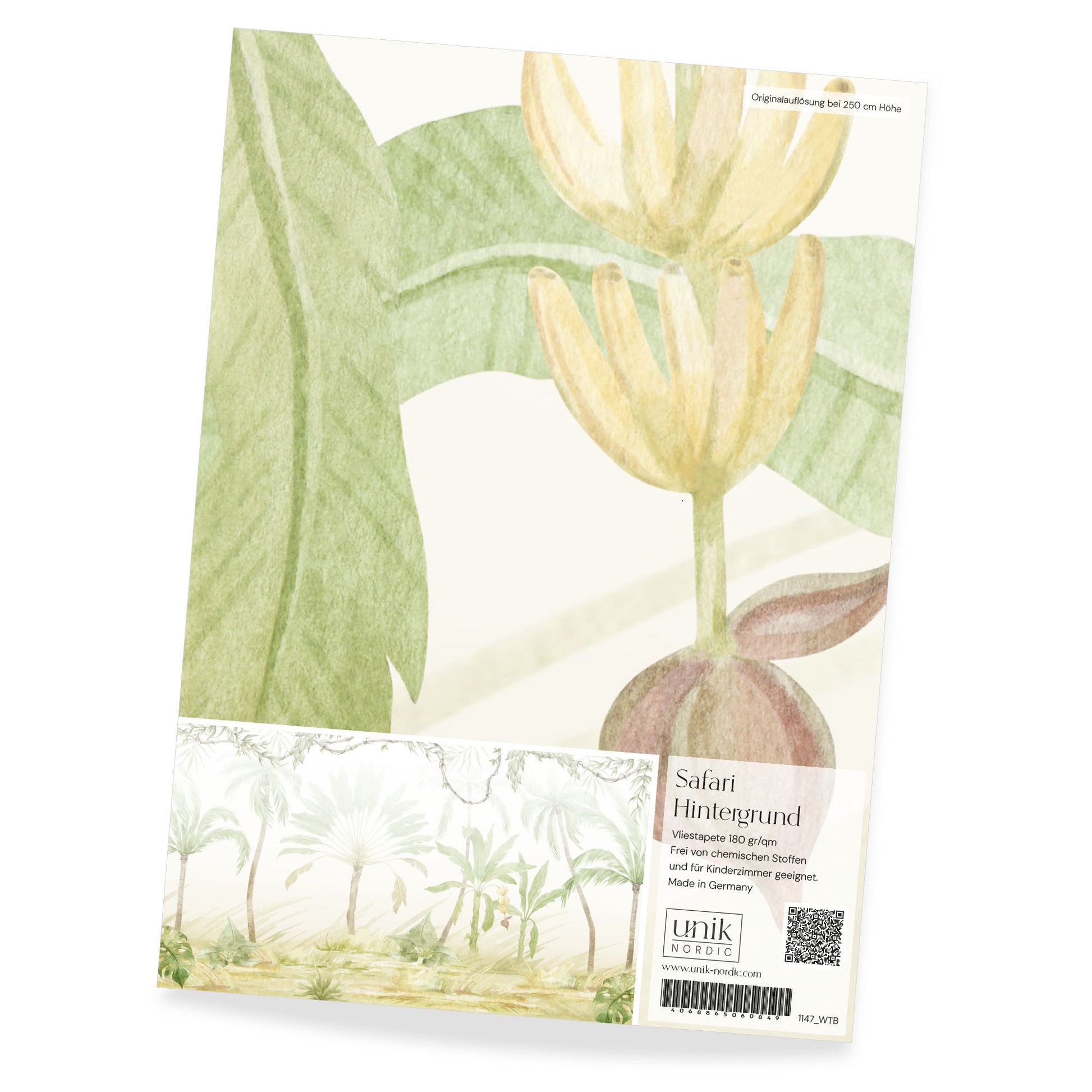 Das ist eine Materialprobe für Kindertapete Safari Hintergrund, damit du dich in Ruhe von der Qualität und dem hochwertigen Druck überzeugen kannst.