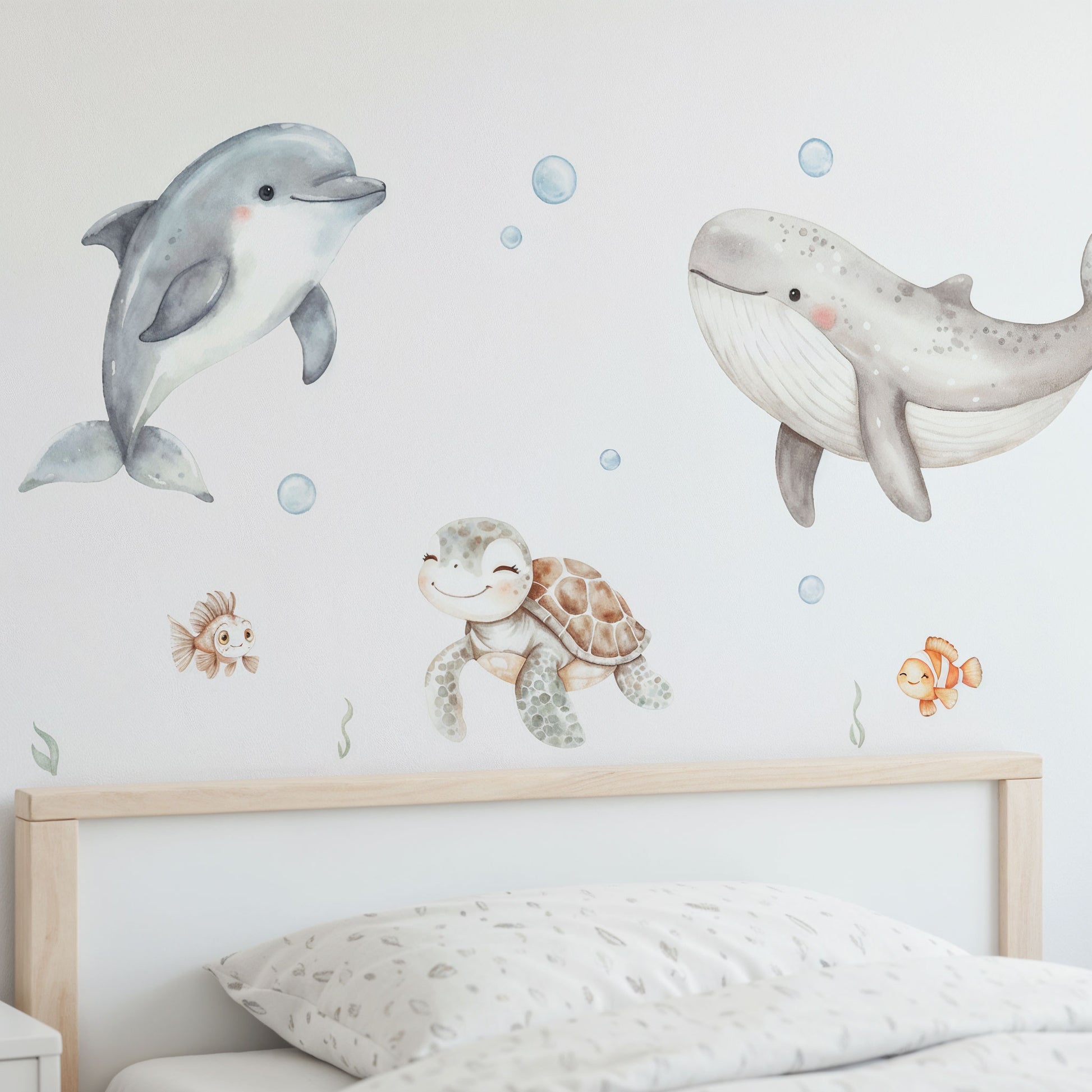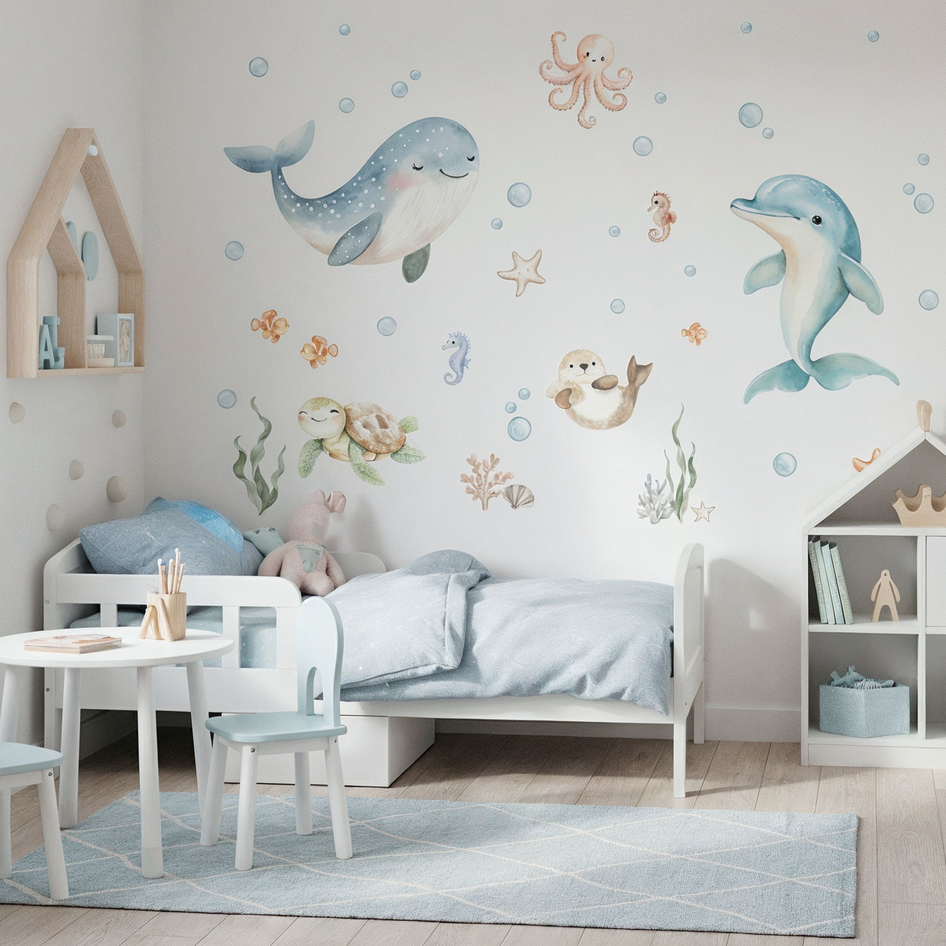 Die sanften Pastellfarben schaffen eine beruhigende Atmosphäre, während die vielen Einzelmotive (Blasen, Muscheln, Korallen, Pflanzen) dir ermöglichen, die Szene ganz frei zu arrangieren. So entsteht ein ganz individuelles Meeresabenteuer – egal ob über dem Bett, Wickeltisch oder als große Unterwasserwand.